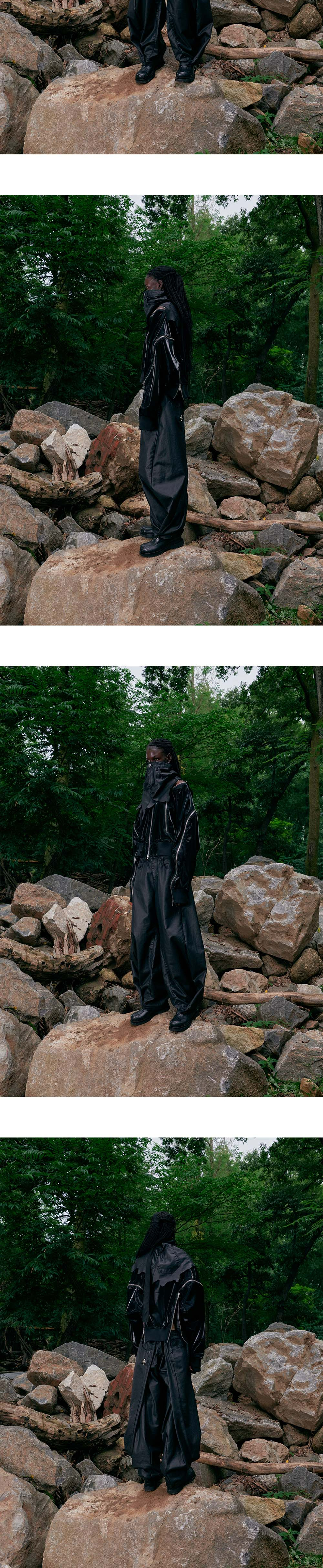 써저리 더블 폴딩 오버 와이드 배기 진 코팅드 블랙