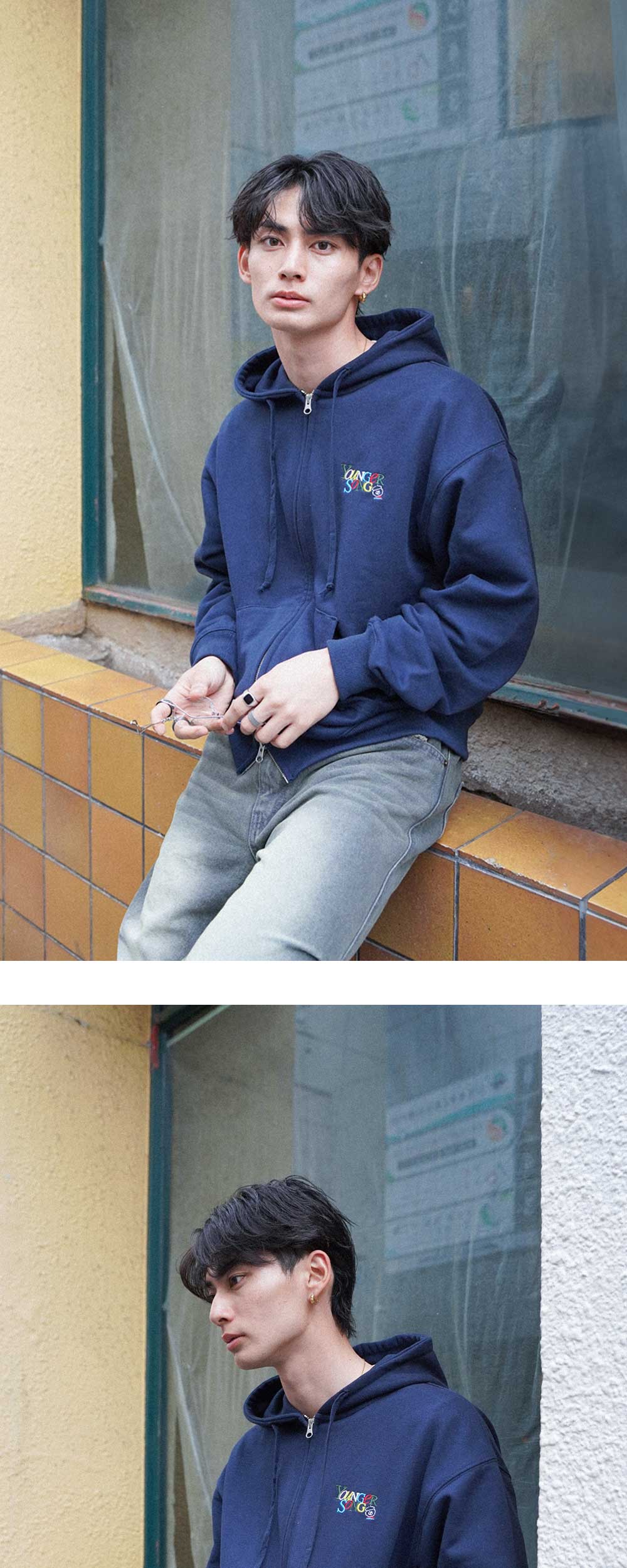 ㆍ워싱된 고퀄리티의 코튼 원단으로 제작된 후드 집업 ㆍ덤블워싱&텐타가공으로 세탁 후 변형 최소화 ㆍ가슴 부분에 프레피한 컬러 조합으로 표현된 자수 디테일 ㆍ위트있는 프린트로 뒷판 포인트 ㆍ세미오버 핏으로 자연스러운 실루엣 연출 ㆍYKK 투웨이 지퍼 사용 ㆍ유니섹스 상품으로 제작