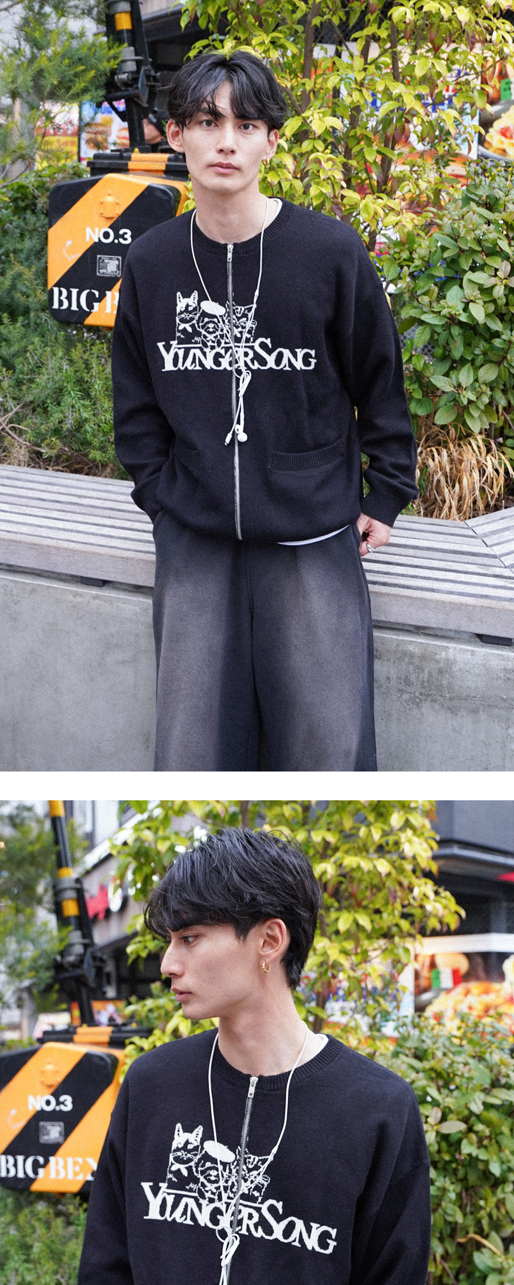 ㆍ아크릴과 코튼 원사로 제작된 자가트 니트 가디건 ㆍ소프트 터치 가공을 통해 착용감이 우수 ㆍ위트있는 협업 그래픽을 전판 자가드로 표현 ㆍ전판 포켓 디테일 ㆍ세미오버 핏으로 자연스러운 실루엣 연출 ㆍ투웨이 지퍼 사용 ㆍ유니섹스 상품으로 제작