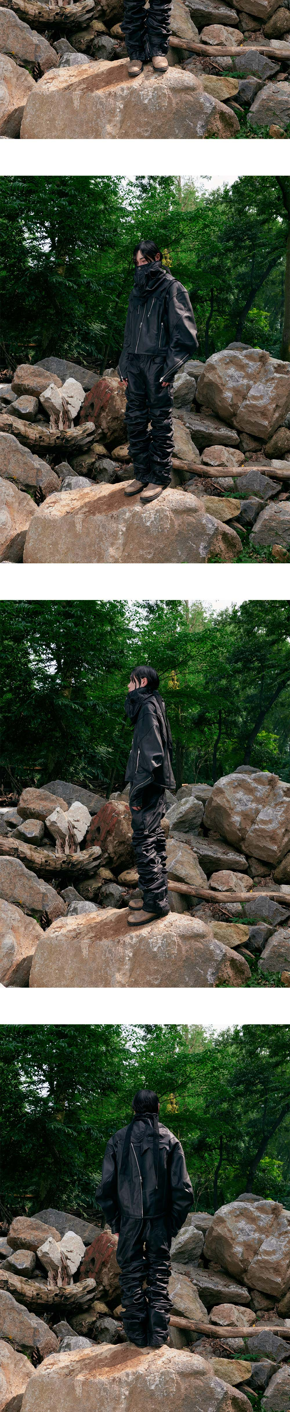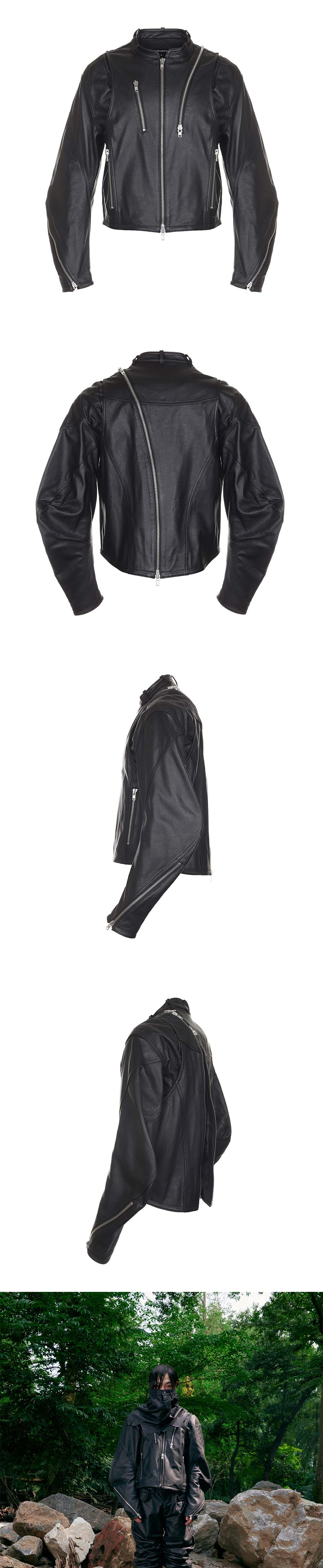 써저리 크루아상 슬리브 레더 자켓 블랙