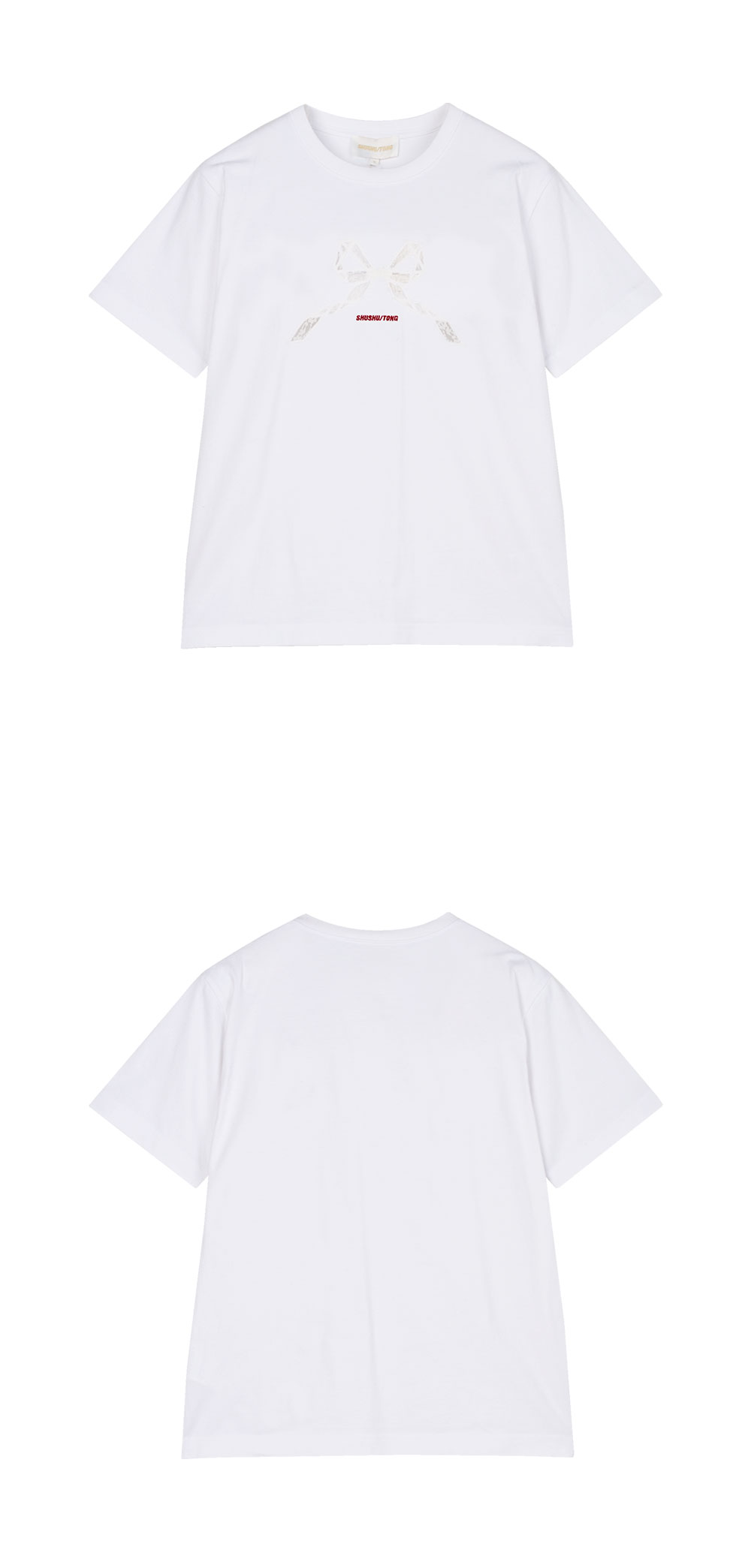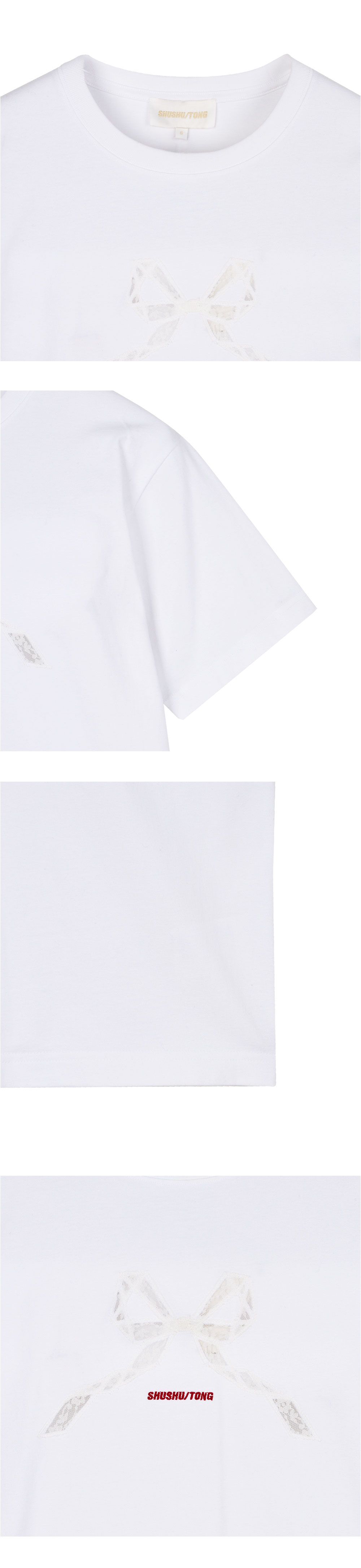 가슴 중앙에 리본 포인트가 매력적인 슈슈통의 우먼 레이스 패치워크 오버사이즈 티셔츠 화이트입니다. - 면 저지 티셔츠 - 리브 니트 크루넥 - 가슴 부분에 레이스 트임이 있는 그래픽 컷아웃 - 전면에 자수가 놓인 로고