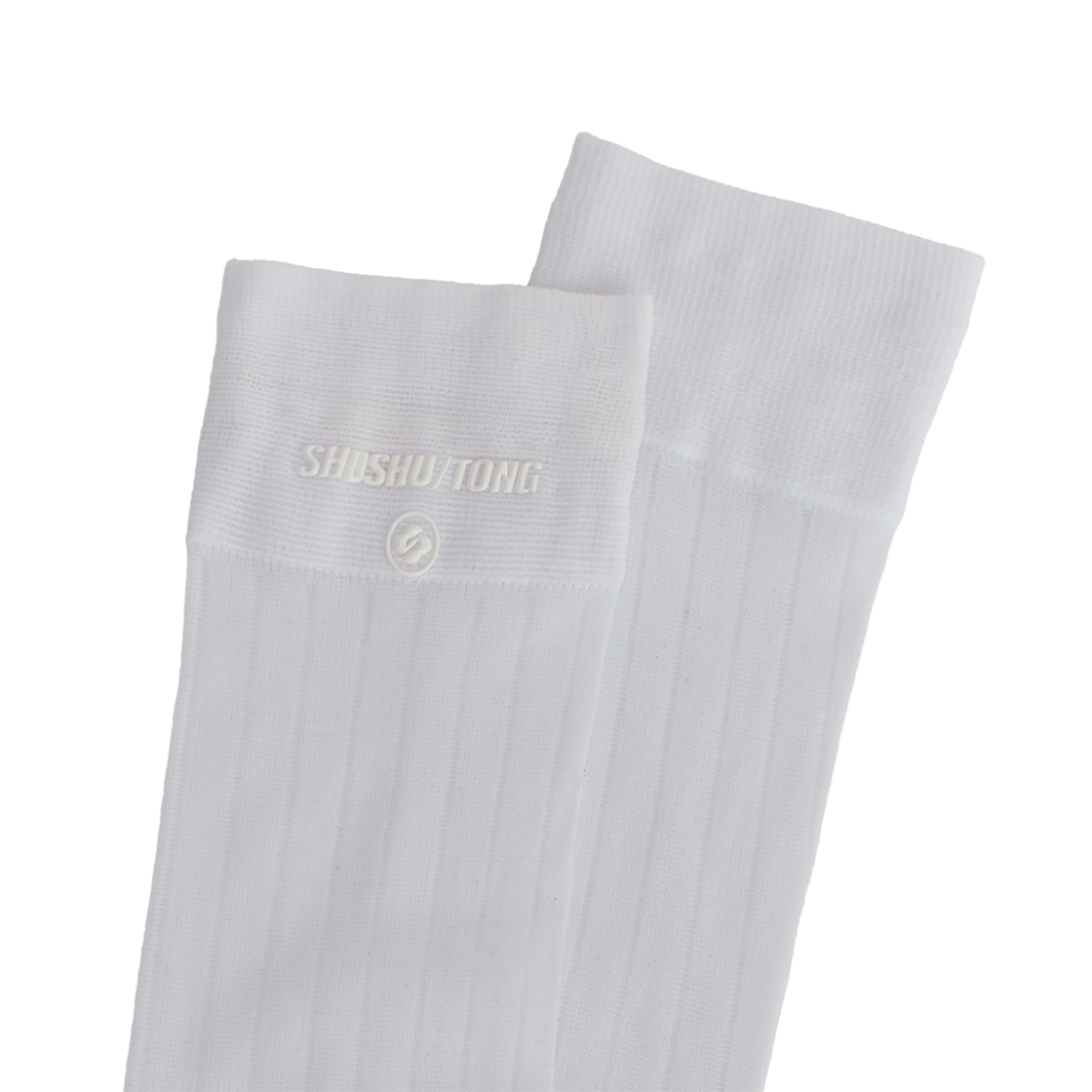 다양한 코디에 활용 가능한 Shushu/Tong의 Knitted Mid Calf Socks (Pack Of 3) White입니다. -시스루 소재 -끝단 로고 디테일