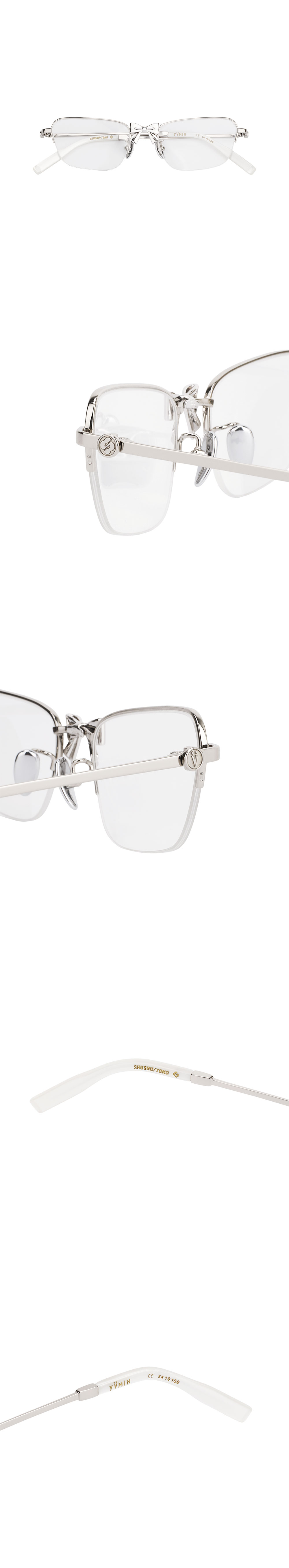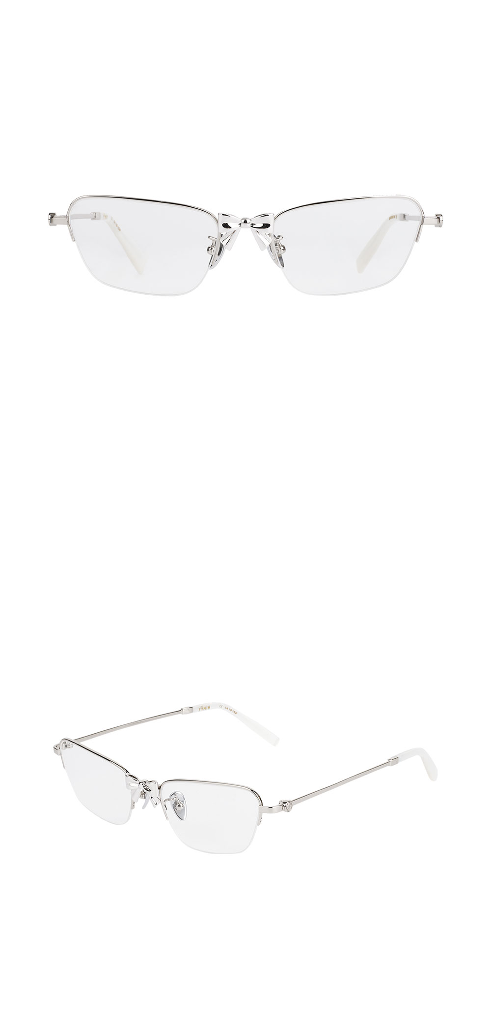 쉐입이 매력적인 Shushu/Tong의 Metal Bowknot Glasses Silver입니다. -양 끝이 올라간 캣츠아이 쉐입 -중앙 리본 디테일 -하프 프레임 디자인