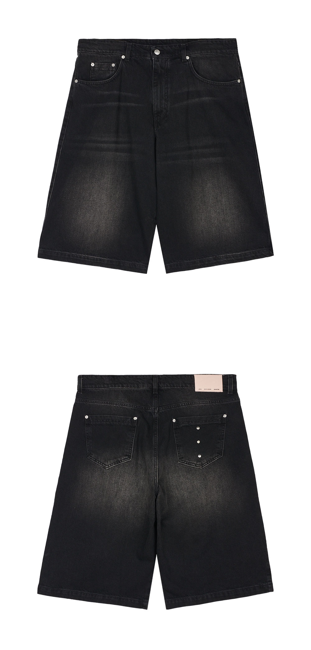 적당한 기장감으로 여름철 활용도가 높은 AOD의 데님 쇼츠 맨 블랙입니다. - 짙은 블랙 컬러의 데님 - 힙 포켓 쪽 스터드 디테일 - 뒷면 로고 탭