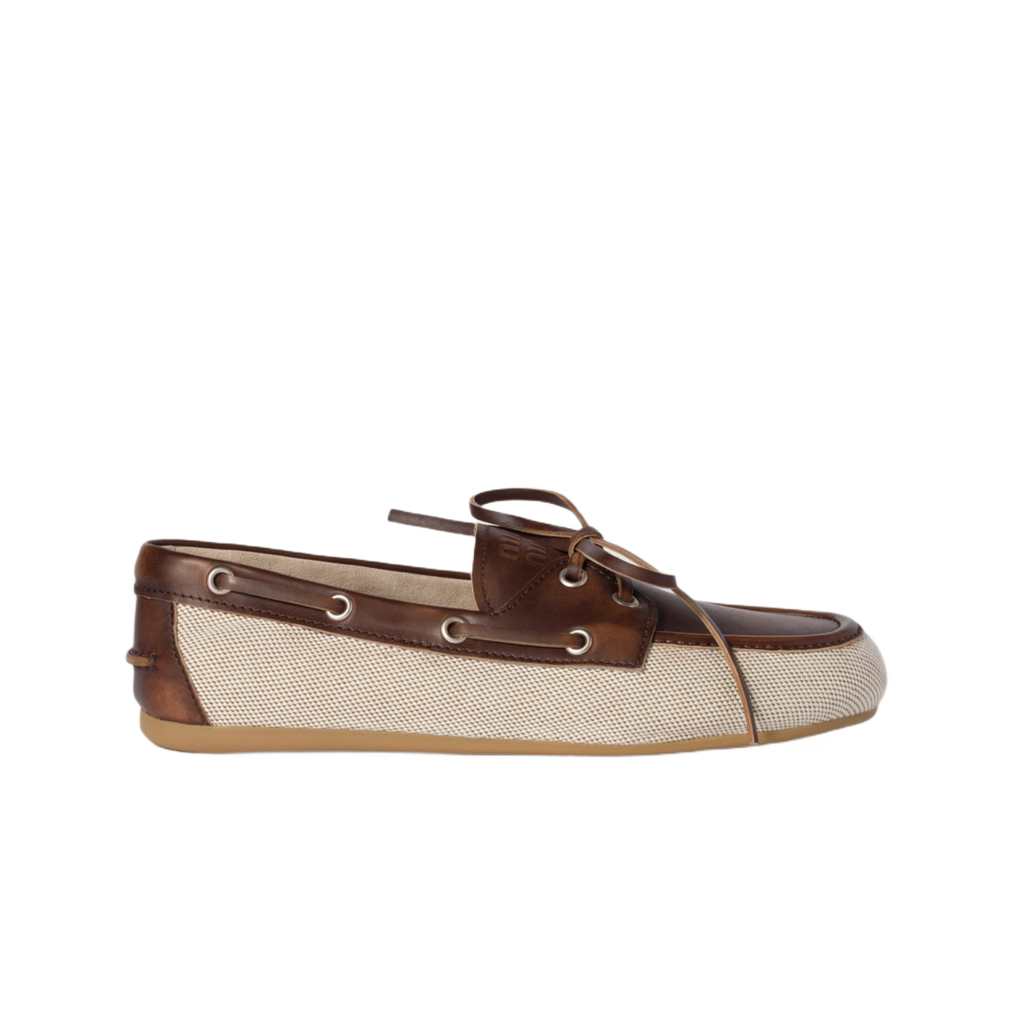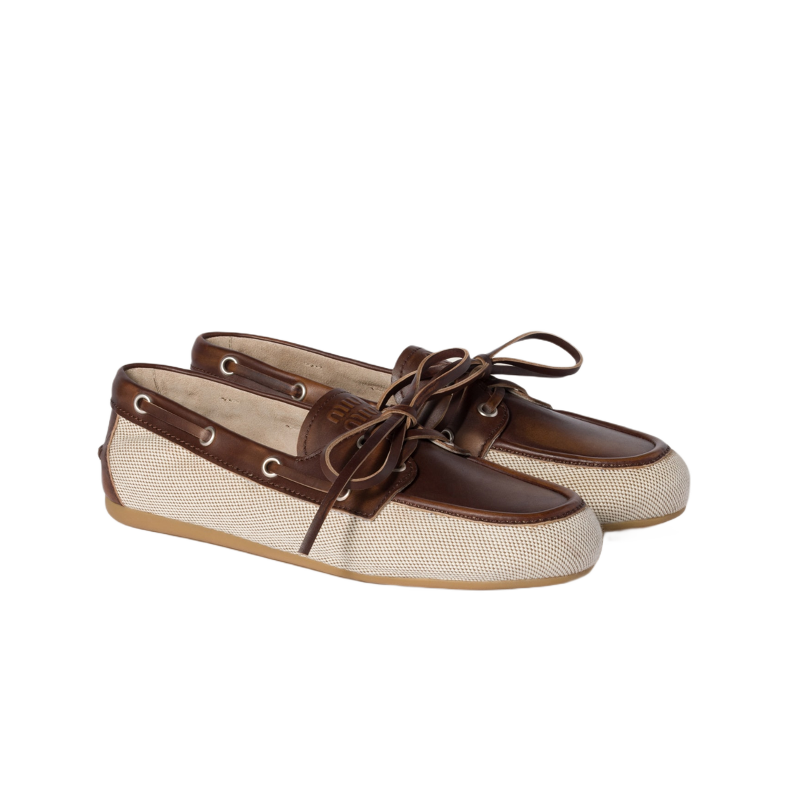 (W) Miu Miu Canvas Bleached Leather Boat Shoes Beige Brown