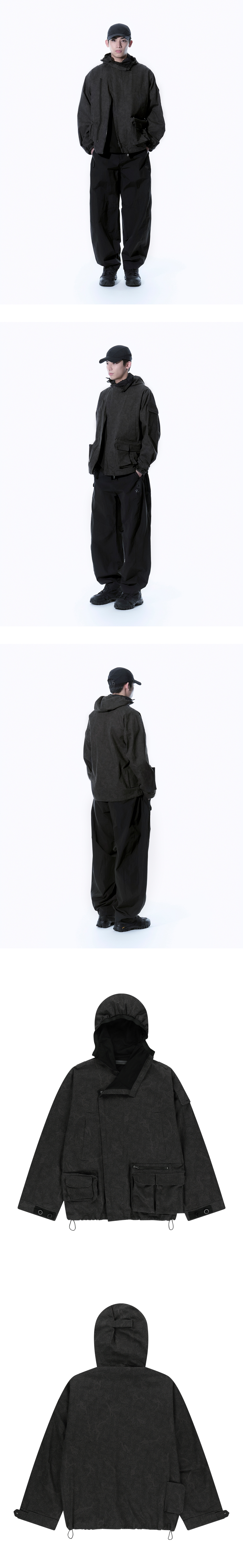 - 전면부 2WAY 지퍼 사용 - 나이트 카모에서 영감 받은 패턴 디자인 - 비대칭 포켓과 단추로 후드 여미는 디테일