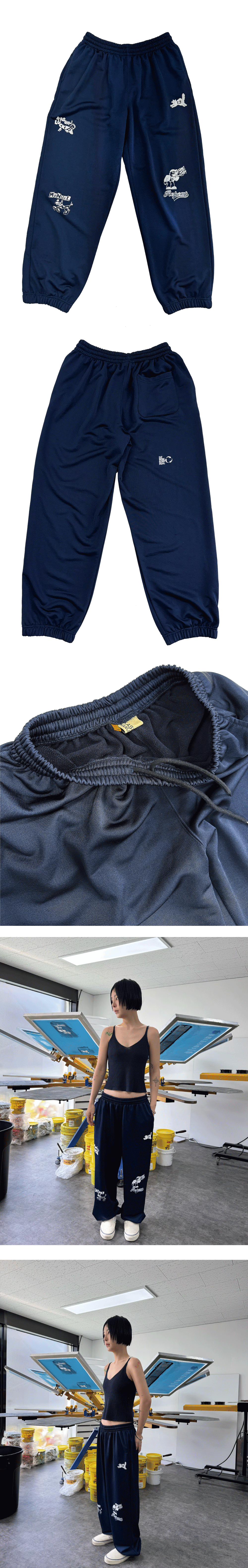 샤이니한 광택감이 있는 폴리 원단으로 제작되어, 조명이나 햇빛 아래에서 은은하게 빛나는 매력적인 텍스처 전면에는 Kasual Manual 감성을 담은 키치한 그래픽들이 실크스크린 기법으로 랜덤 배치되었습니다. “Respect”, “Manual”, 귀여운 캐릭터 등 각기 다른 의미와 스타일을 가진 그래픽이 들어갔습니다. 뒷면에도 작은 심볼 포인트가 들어가 있어서 360도 어디서 봐도 유니크합니다! - 여유 있는 와이드 핏에 밑단 밴딩 처리로 조거 스타일 허리는 전체 밴딩 + 스트링으로 편안한 착용감 한쪽 뒷주머니 디테일