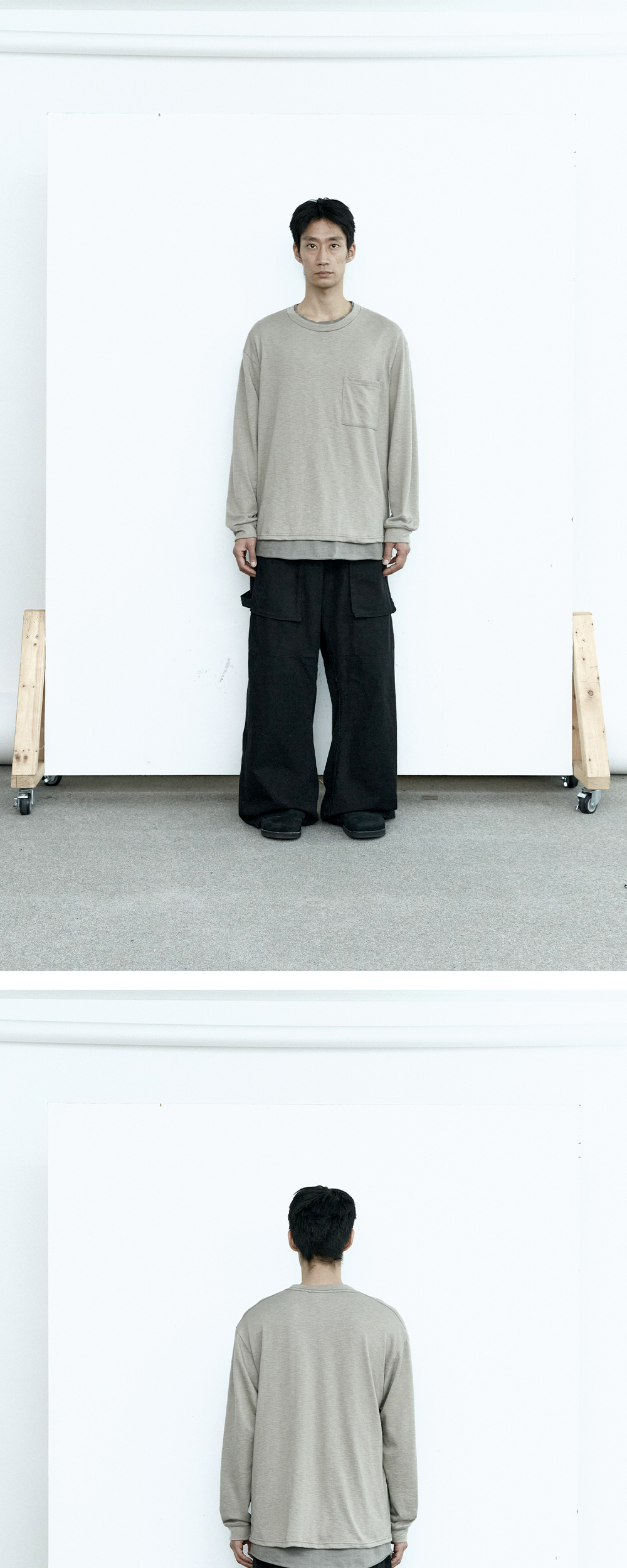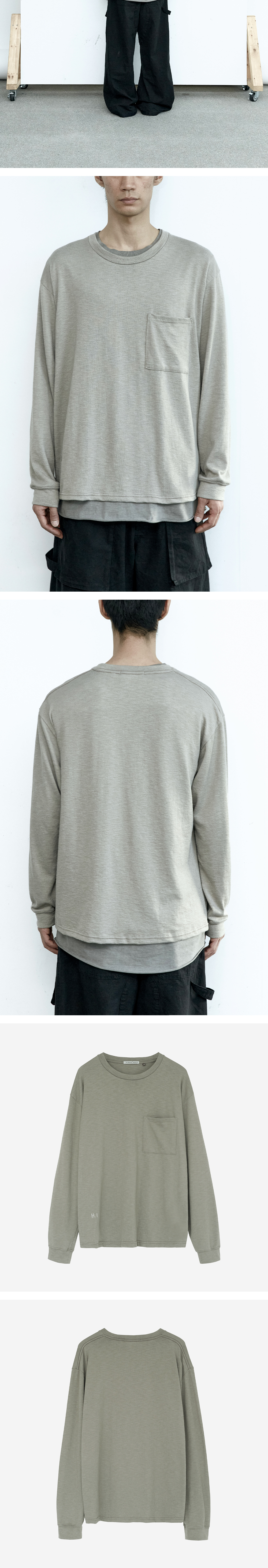 human pocket long sleeve - 슬러비한 텍스쳐의 포켓 롱슬리브 - 가먼트 워시 및 다잉 - 부드러운 촉감 - 드레이퍼리한 물성 - 단품 착용 기준, 휴먼 슬리브리스 및 이너티셔츠와의 매칭을 염두에 둔 패턴입니다.