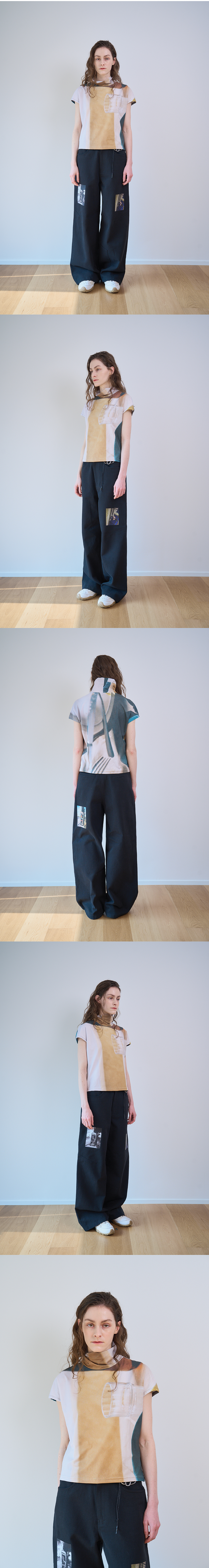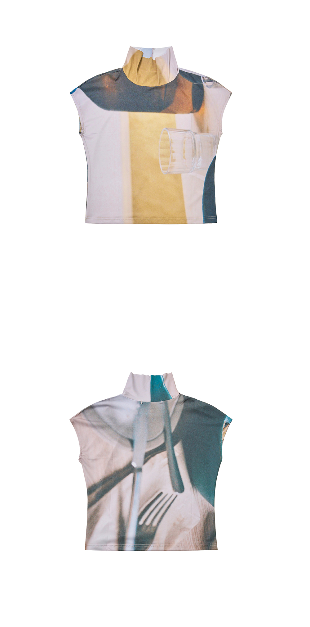 Detail Cropped high neck t-shirt Photo printed throughout Soft-touched cooling fabric signature item 크롭한 기장에 하이텍티셔츠 포토 프린팅 원단 부드러운 터치감의 쿨링 원단 COMPOSITION Polyester 98%, Span 2% SIZE MEASUREMENT - Size OS: Length 50cm_Chest 49cm_Shoulder + Sleeve 33cm Made in S o u t h Korea Washing instructions Dry clean recommended Hand wash cold Wash separately Do not bleach