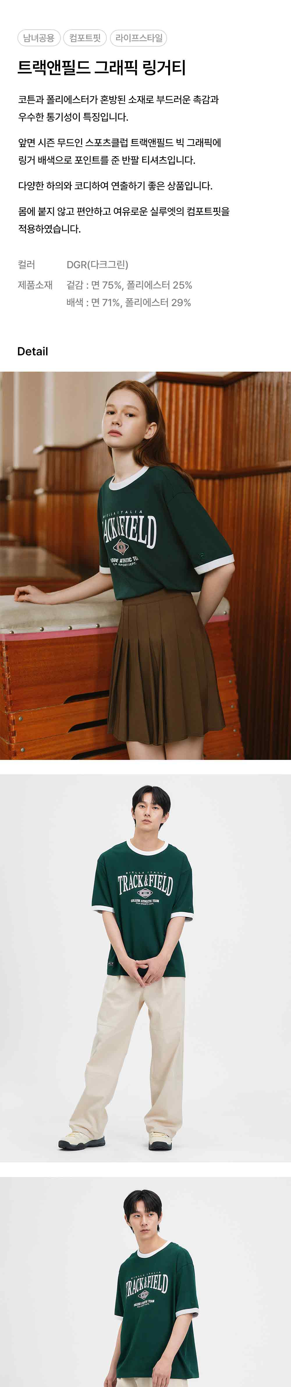 코튼과 폴리에스터가 혼방된 소재로 부드러운 촉감과 우수한 통기성이 특징입니다.앞면 시즌 무드인 스포츠클럽 트랙앤필드 빅 그래픽에 링거 배색으로 포인트를 준 반팔 티셔츠입니다. 다양한 하의와 코디하여 연출하기 좋은 상품입니다. 몸에 붙지 않고 편안하고 여유로운 실루엣의 컴포트핏을 적용하였습니다.
