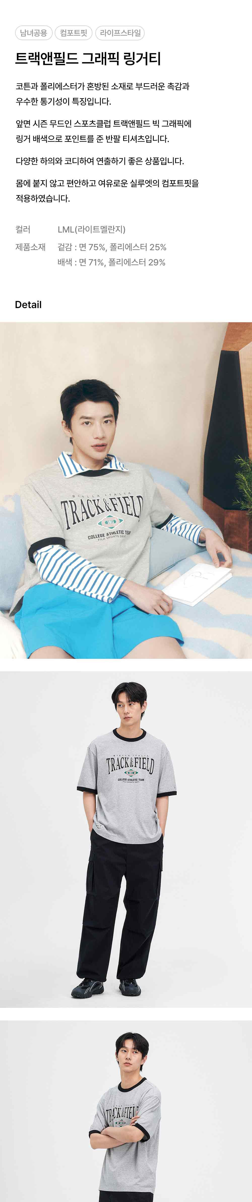 코튼과 폴리에스터가 혼방된 소재로 부드러운 촉감과 우수한 통기성이 특징입니다.앞면 시즌 무드인 스포츠클럽 트랙앤필드 빅 그래픽에 링거 배색으로 포인트를 준 반팔 티셔츠입니다. 다양한 하의와 코디하여 연출하기 좋은 상품입니다. 몸에 붙지 않고 편안하고 여유로운 실루엣의 컴포트핏을 적용하였습니다.