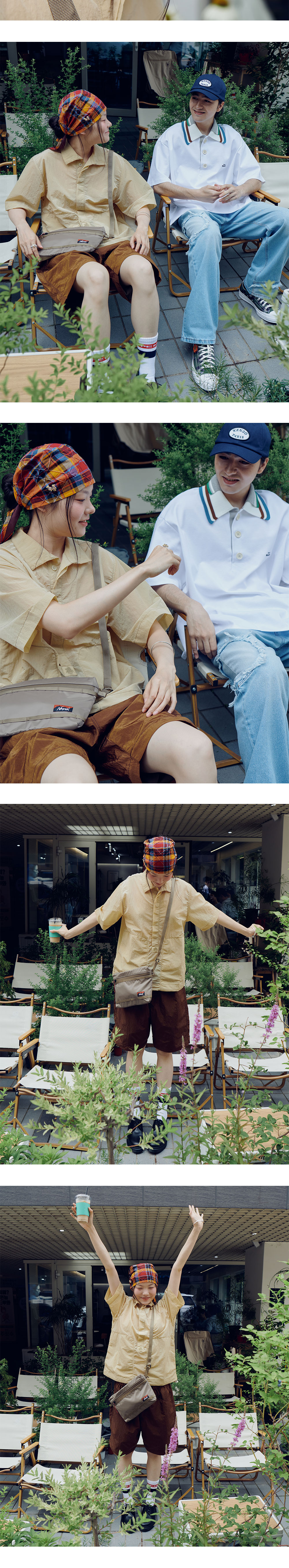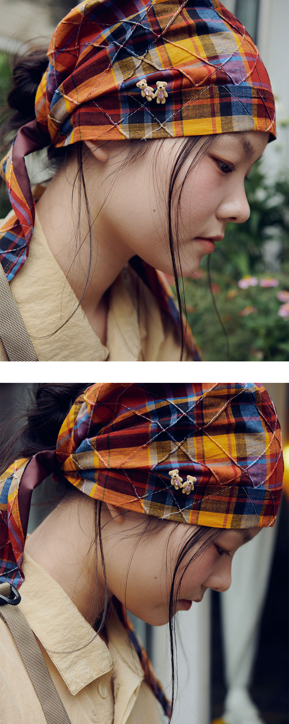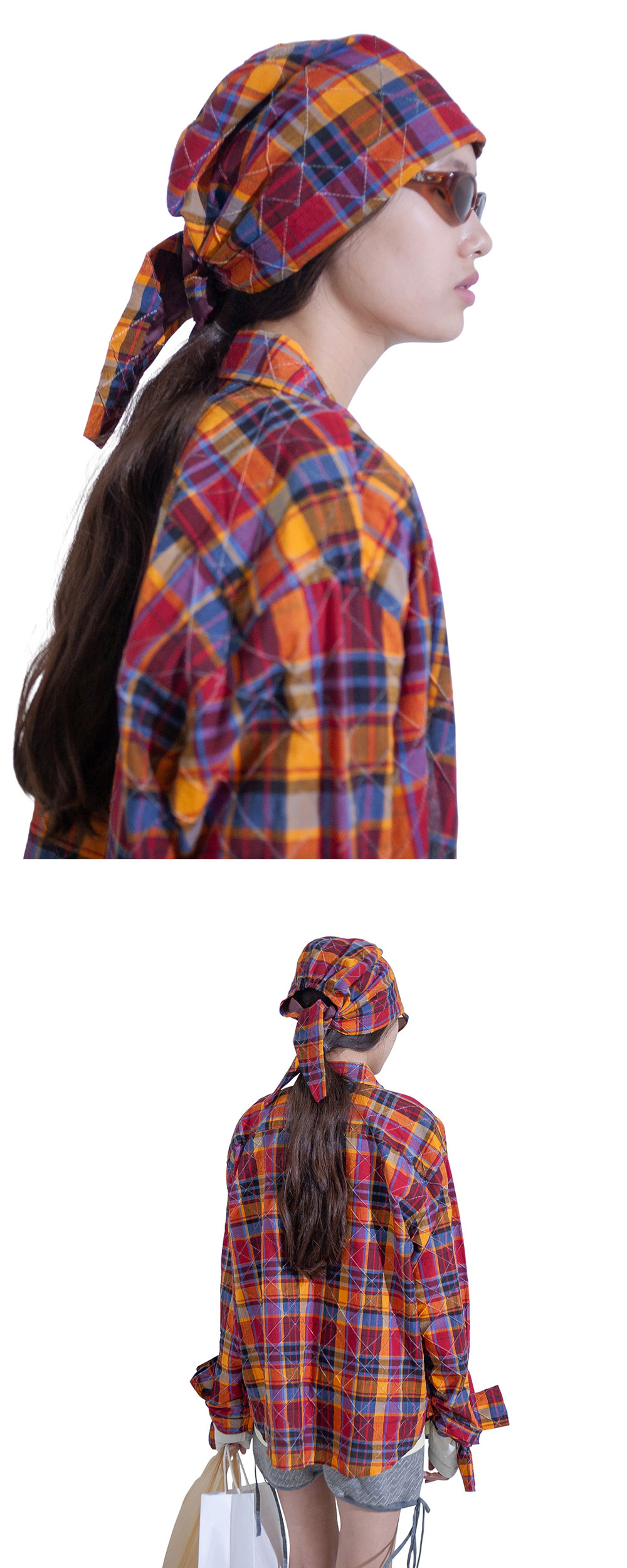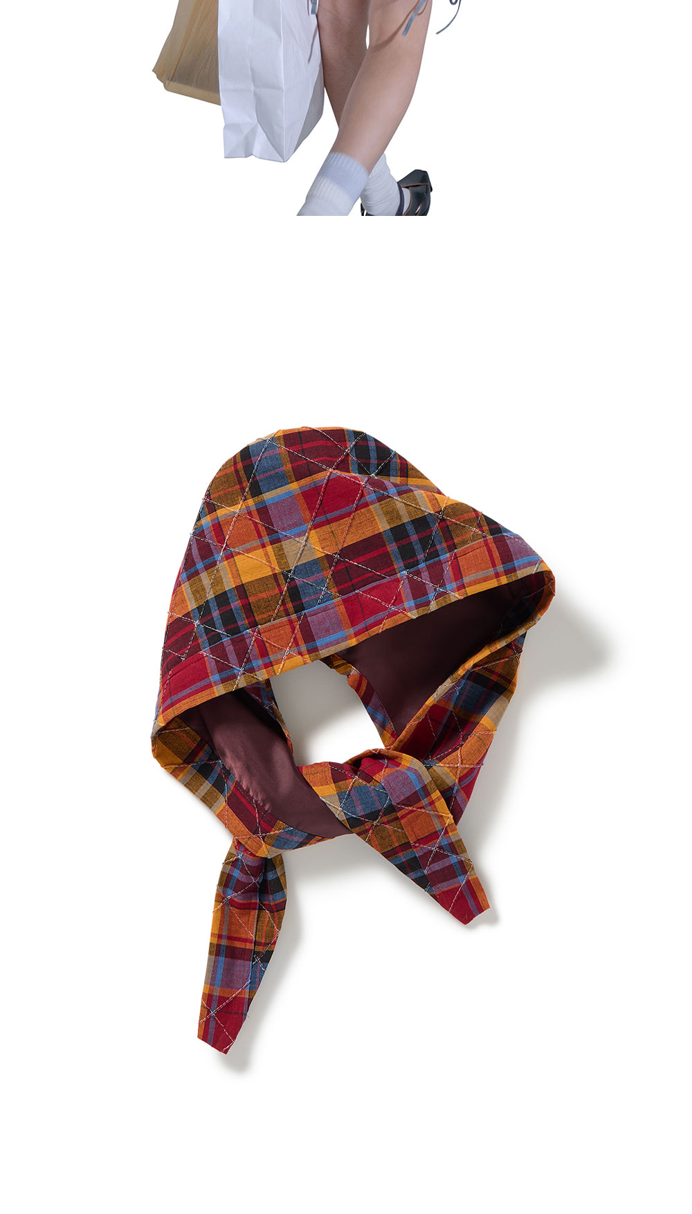 데드스톡 및 빈티지 원단으로 제작된 퍼버즈의 우먼 헤드 앤 넥 스카프 오렌지입니다. - 감각적인 후드 디자인 - 스타일링이 자유로운 셀프 타이 디테일 - 2000년대 초반 원단 사용 - Made in Japan