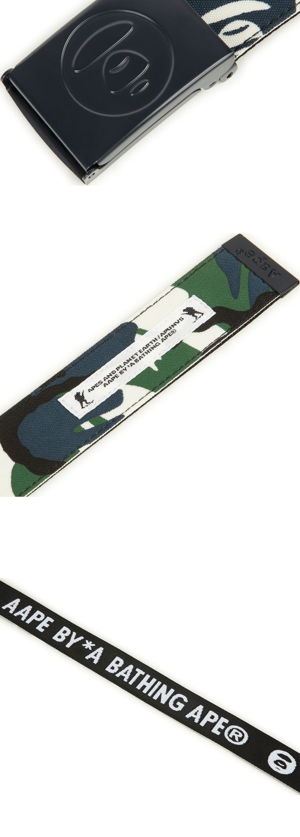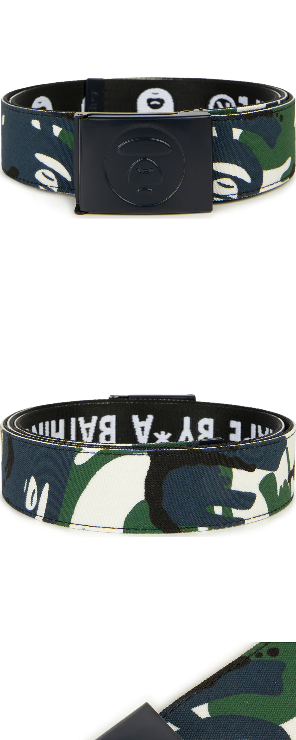 포인트로 활용하기 좋은 독특한 색감을 가진 에이프의 베이직 벨트 네이비 그린입니다. -자가드 직조로 입체적인 패턴 표현 -버클 및 벨트 안쪽의 로고 디테일 -자유롭게 사이즈 조절 가능