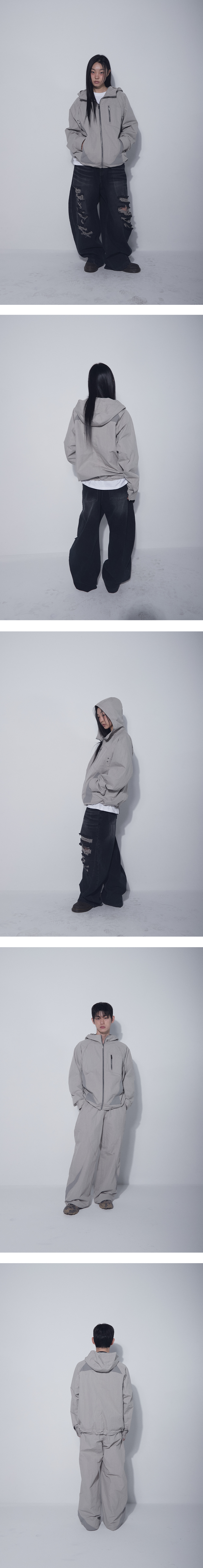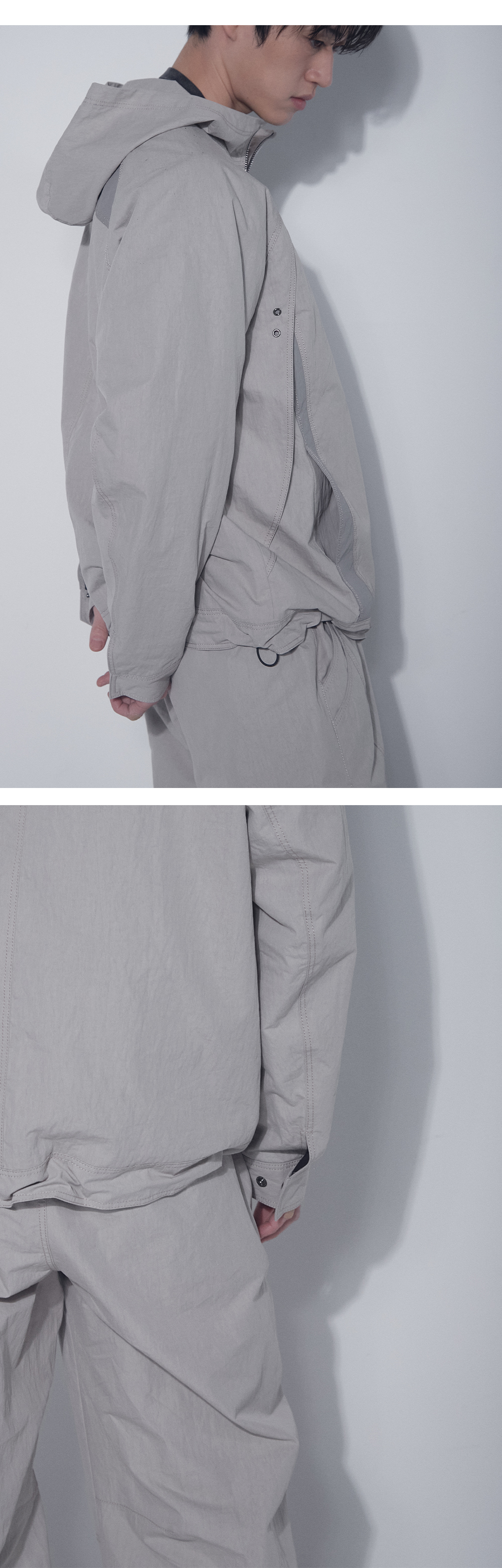 곡선 배색 패널 디테일로 유니크한 실루엣을 연출하고, 전면부 날개 디테일로 입체감을 더했습니다. 밑단 스트링을 통해 체형에 맞게 핏 조절이 가능하며, 가볍고 얇은 베이지 컬러 윈드브레이커로 편안한 착용감을 제공합니다. 후면부에는 BLR 시그니처 데님 라벨을 부착해 브랜드의 아이덴티티를 강조했습니다.