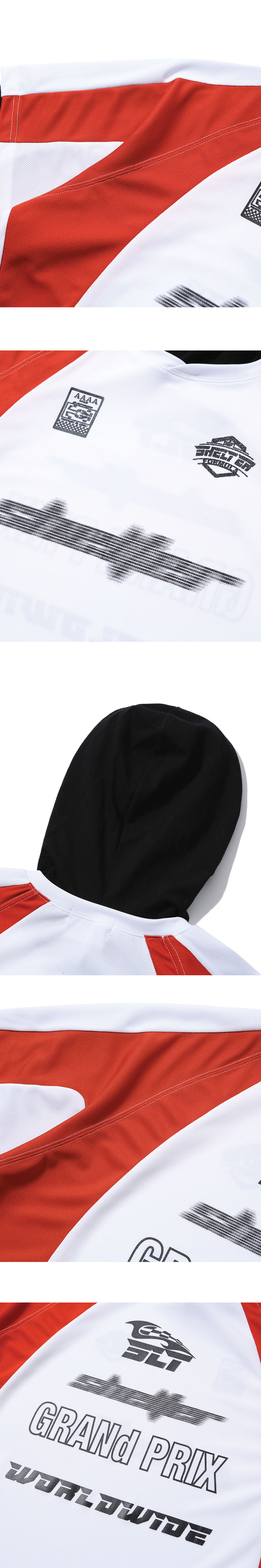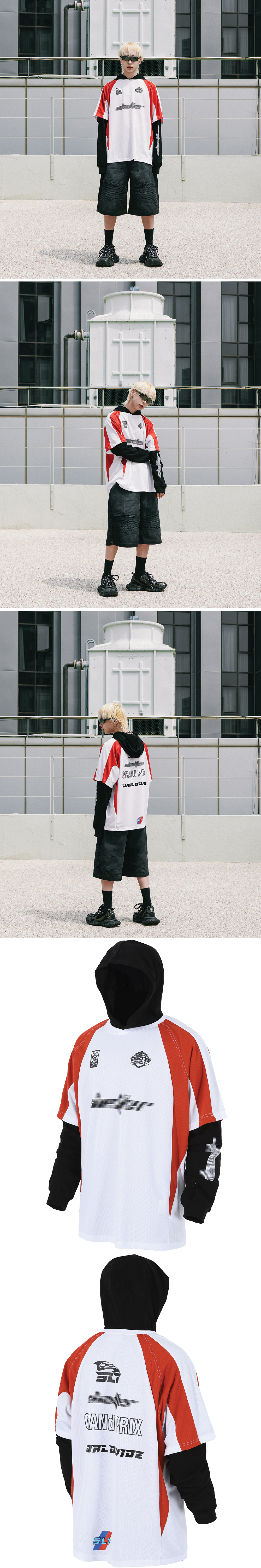 Layered hooded sleeve Fabric : 1. Nylon 100% 2. Cotton 100% - 오버 핏 - 흡한속건 기능성 스포츠 원단 - 소매 및 후드 레이어드 - 전면 후면 소매 프린팅 • 제조국 : 대한민국 • 물 세탁이 가능하며, 찬물 세탁 권장 • 건조기 사용은 제품의 변형과 원단 수축을 유발 할 가능성이 있습니다. Size Guide (단위 CM) M : 가슴 66 , 소매 80 , 총장 71 L : 가슴 69 , 소매 82 , 총장 73