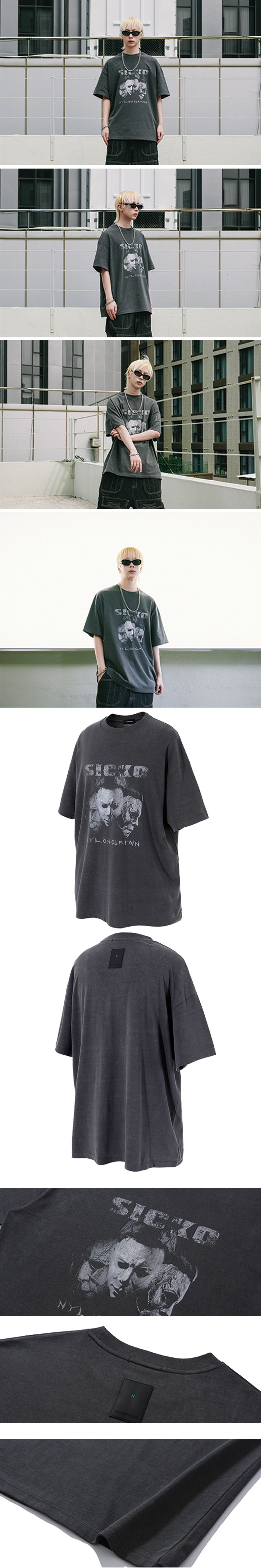 Fabric : Cotton 100% - 오버 핏 - Pigment washing - Digital text printing graphic - Signature rubber label point • 제조국 : 대한민국 • 물 세탁이 가능하며, 가급적 미온수에 뒤짚어 세탁 • 건조기 사용은 제품 변형과 원단 수축을 유발 할 가능성이 있으니 삼가하시길 바랍니다. • 피그먼트 워싱 원단으로 원단에 워싱 주름이 있으며, 제품마다 효과가 다를 수 있음 Size Guide (단위 CM) : L : 어깨 59, 가슴 62, 총장 76, 소매 20 XL : 어깨 62, 가슴 64, 총장 77, 소매 21