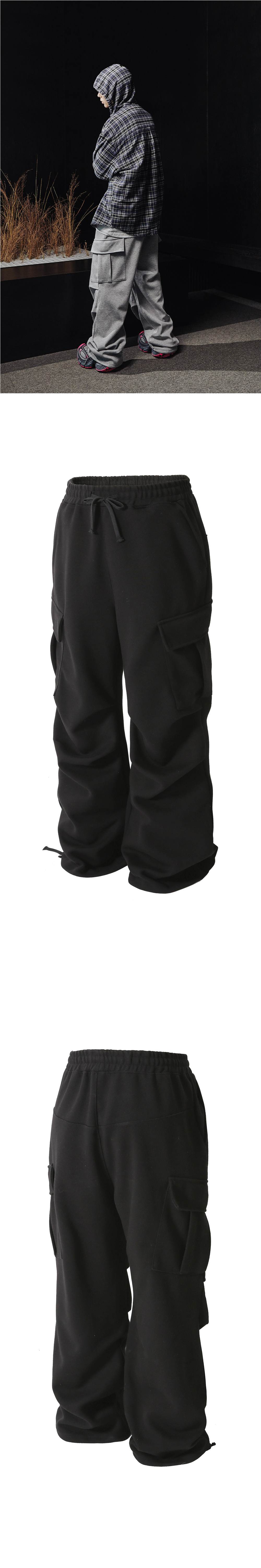 Fabric : Cotton 75%, Polyster 25% - 와이드 핏 - 파라슈트 디테일 - 빅 카고 포켓 - 밑단 조임 스트링 - 자체 개발 원단으로 겉면과 내부 원단의 부드러운 촉감이 특징 • 제조국 : 대한민국 • 세탁 방법 : 뒤집어 세탁망 세탁 권장, 건조기 사용 금지 Size Guide (단위 CM) M : 허리 36, 허벅지 35, 밑위 36, 엉덩이 56, 밑단 29, 총장 110 L : 허리 38, 허벅지 37, 밑위 37, 엉덩이 58, 밑단 30, 총장 112