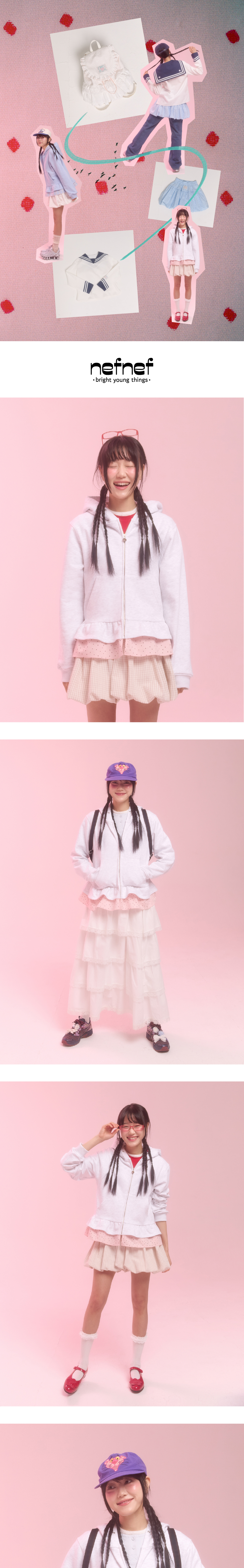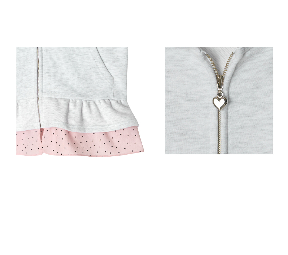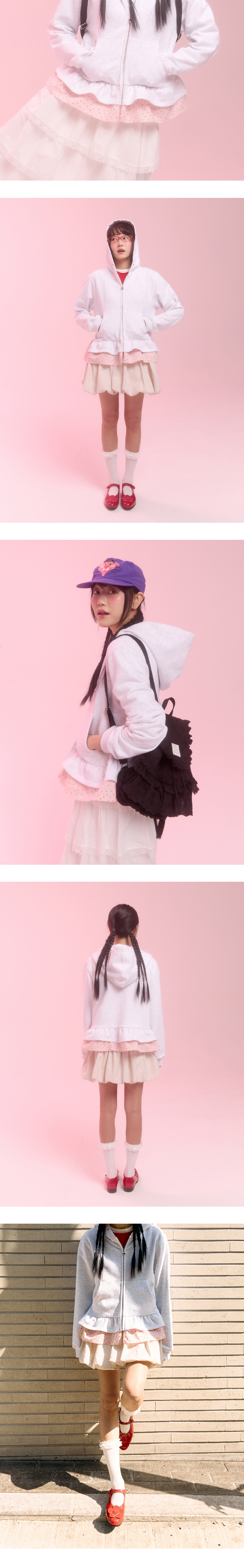 밑단의 러플과 이중으로 덧대어진 도트 원단으로 레이어드 디테일을 살린 사랑스러운 후드 자켓입니다. 너무 두껍지 않은 소재로 다가온 봄 가볍고 편안하게 착용하기 좋습니다. 착용시 귀여운 핏감을 위해 후드 사이즈를 넉넉하게 제작했습니다. 하트 디테일의 지퍼 슬라이더를 사용해 포인트를 더했습니다.