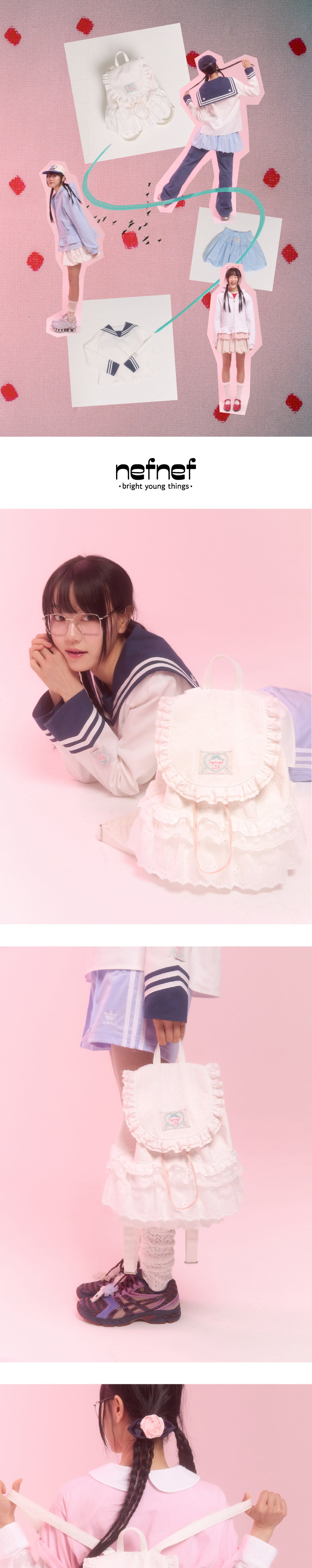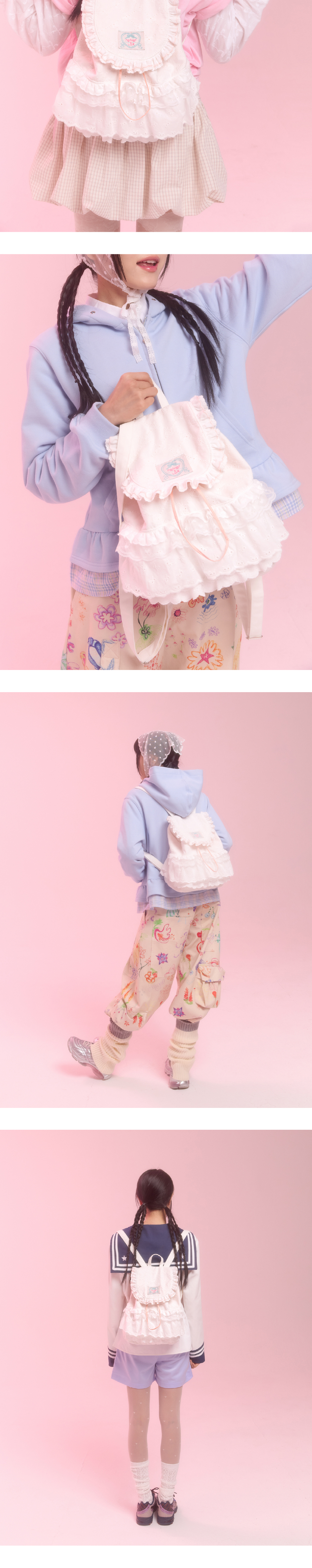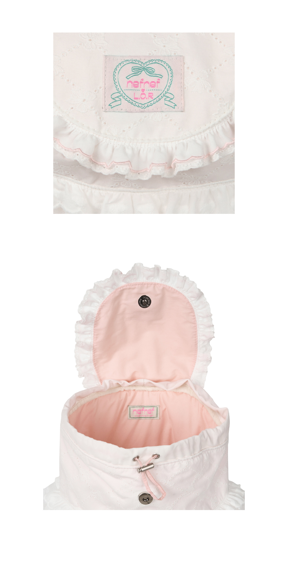 5종류의 각기 다른 레이스 원단이 사용된 패브릭 백팩입니다. 수많은 레이스 샘플들을 조합해 본 후 고민 끝에 만든 제품입니다. 네프네프가 사랑하는 리본과 하트 디테일이 가득한 너무나도 사랑스러운 제품입니다. 타원형 밑판으로 수납력도 좋은 편입니다. 가벼운 무게감으로 부담 없이 어디든 함께해 주세요.
