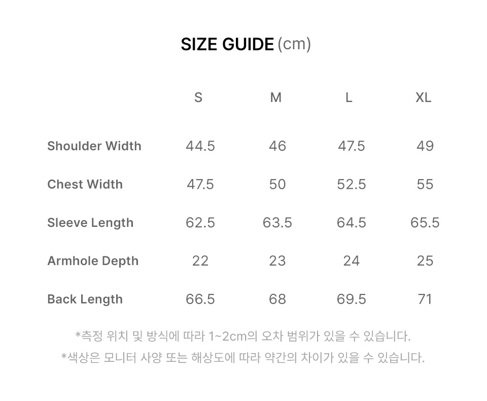 | 어깨 | 가슴단면 | 소매장 | 총기장 | 밑단 |