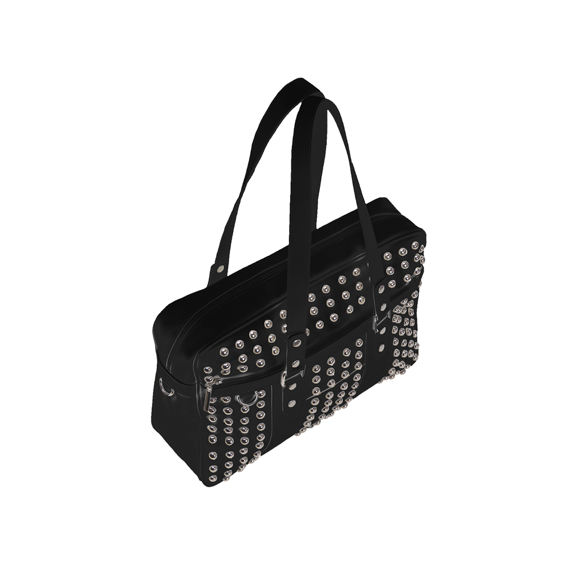 스쿨백 스타일의 숄더백 더블 스트랩 전면부 흑니켈 스터드 디테일 내/외부 포켓 내장 Size(Width/Height/Depth/Strap Length) 1 : 38cm/27cm/12cm/31.5cm Polyurethane 100%Polyester 100%