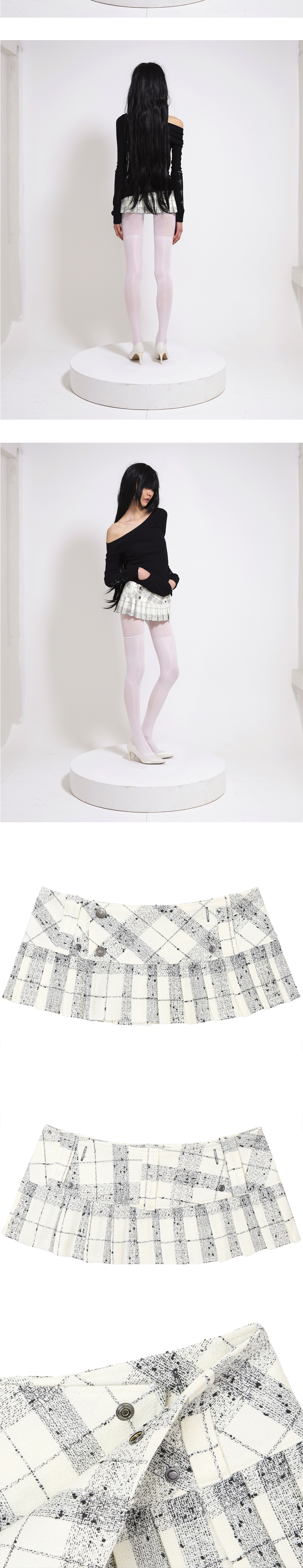 마이크로 기장의 플리츠 스커트 스냅 디테일 체크 패턴의 트위드 원단 밑단 컷오프 디테일로 자연스러운 올풀림 연출 Size(Length/Waist/Hem) 1 : 20cm/35cm/48.5cm 2 : 20cm/38cm/51.5cm 3 : 20cm/41cm/54.5cm Acrylic 77% Rayon 13% Polyester 10%