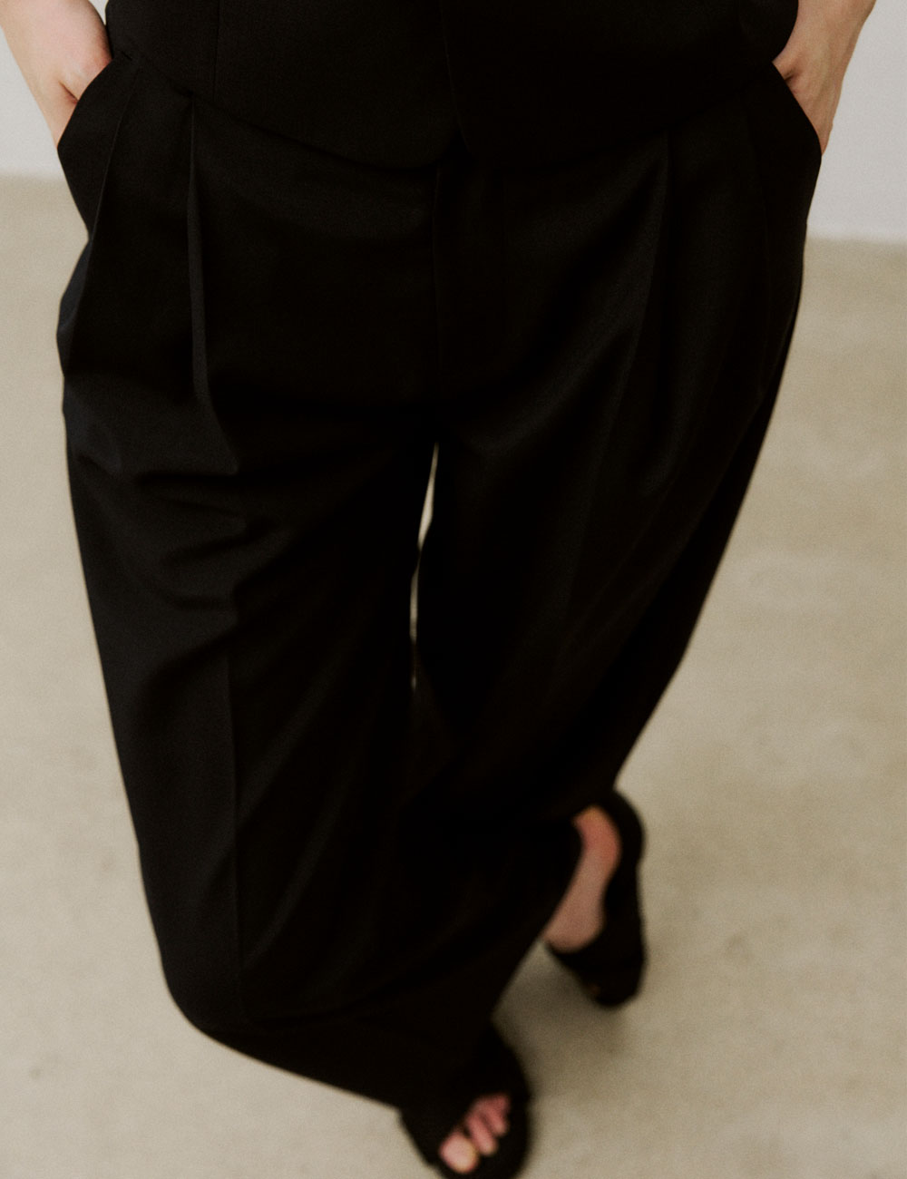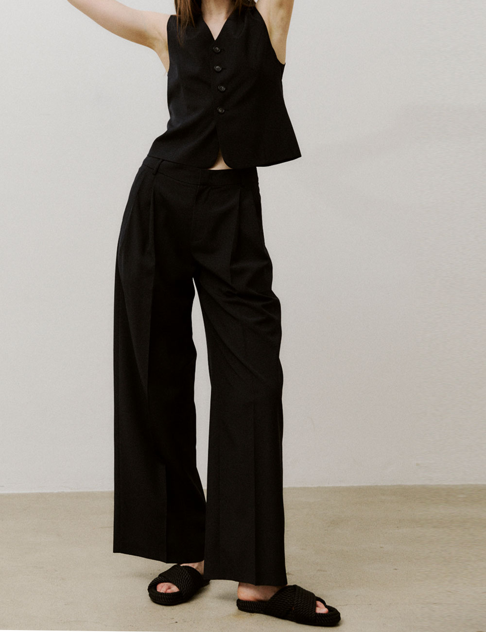 - 와이드 핏의 여유로운 실루엣 - 앞 양쪽에 투 턱 디테일 - 구김이 잘 가지 않는 울 혼방 원단으로 편안한 착용감 - SUMMER WOOL WAISTCOAT와 셋업으로 착용가능