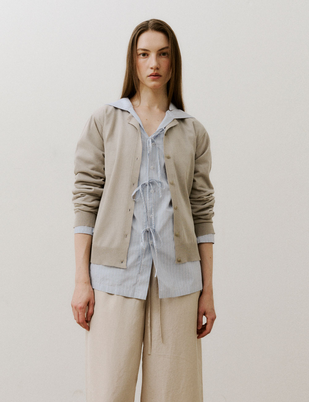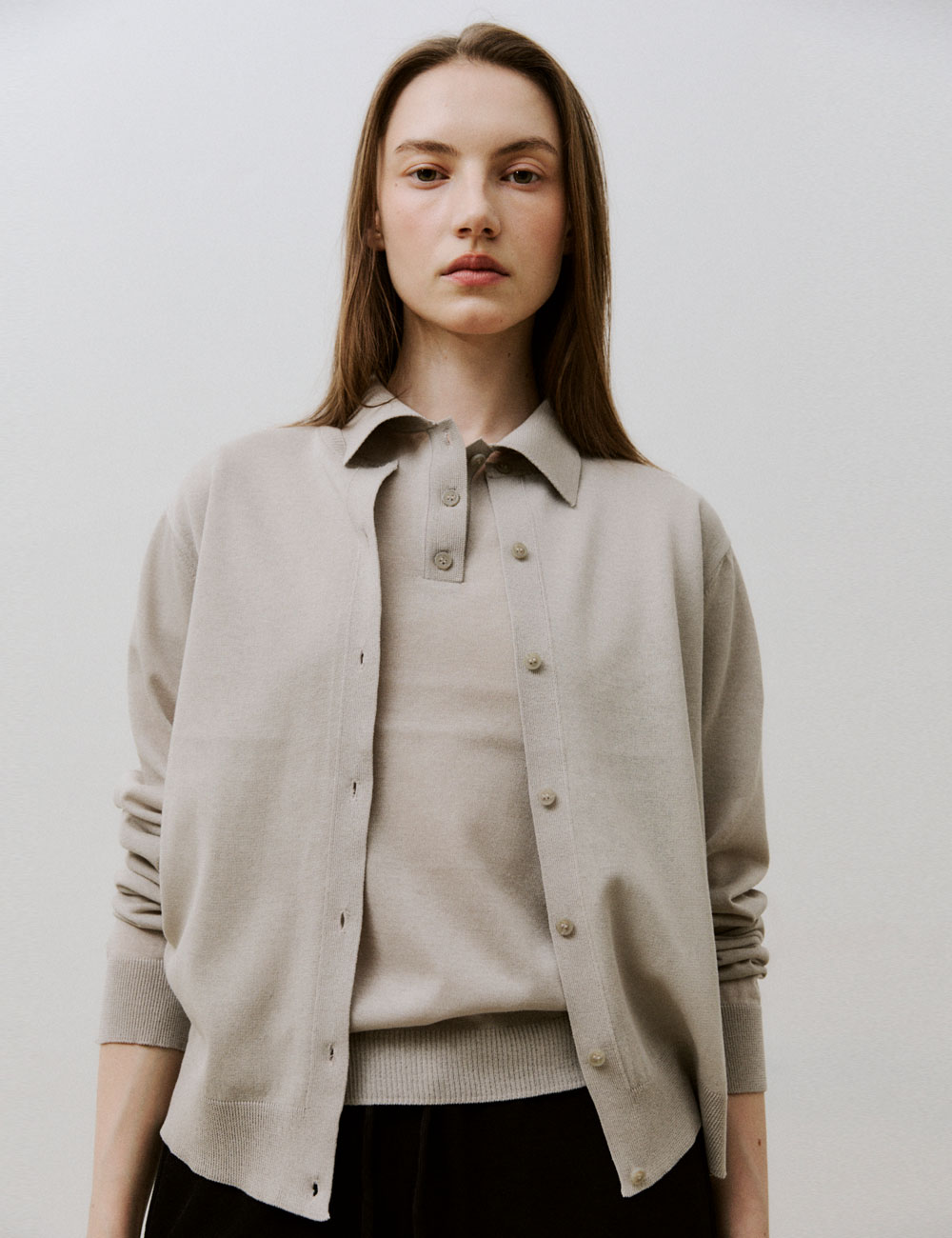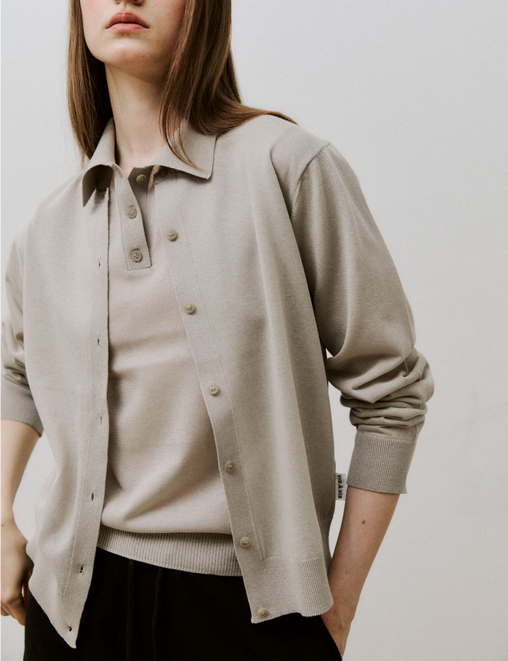 - 레귤러 핏의 면 혼방 니트 가디건 - 버튼 여밈, 크루넥과 소매, 밑단에 골지 니트 - 옆선에 포인트 라벨 디테일 - CP CARDIGAN KNIT와 셋업으로 착용 가능