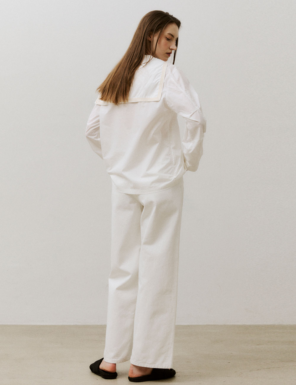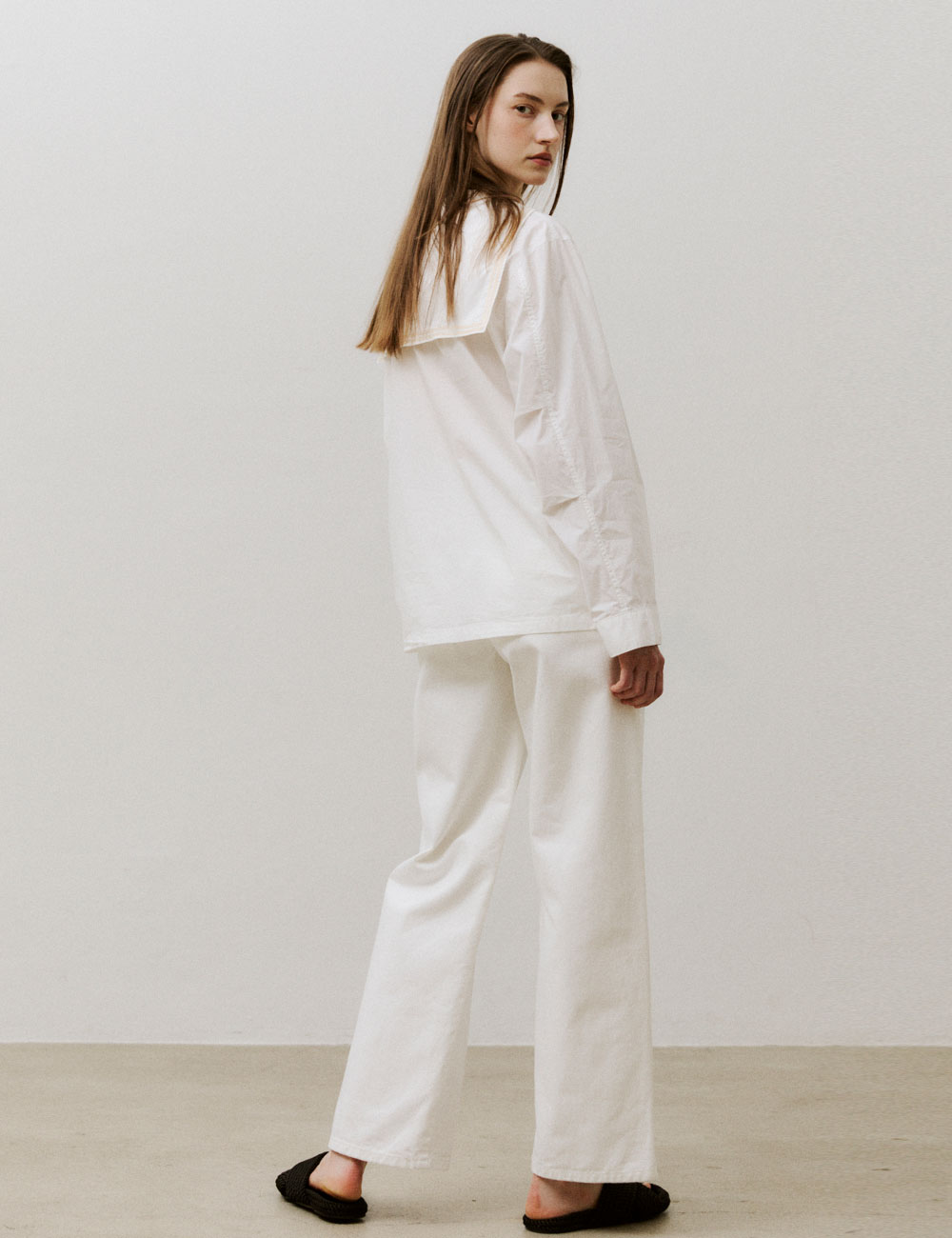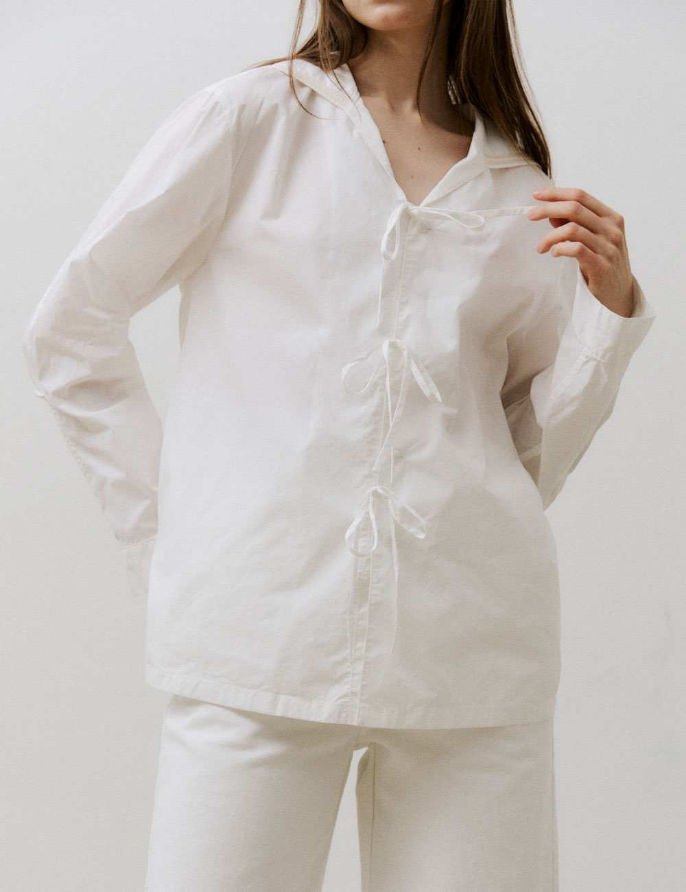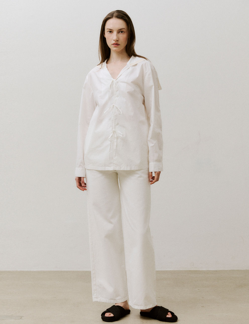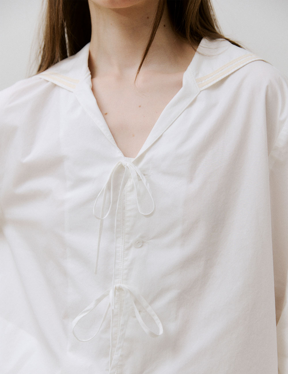 - 레귤러 핏의 스트라이프 면 셔츠 - 워싱 가공으로 부드럽고 자연스러운 터치감 - 세일러 칼라와 버튼 여밈과 리본타이 - 사이드 포켓 - 소매에 턱 디테일