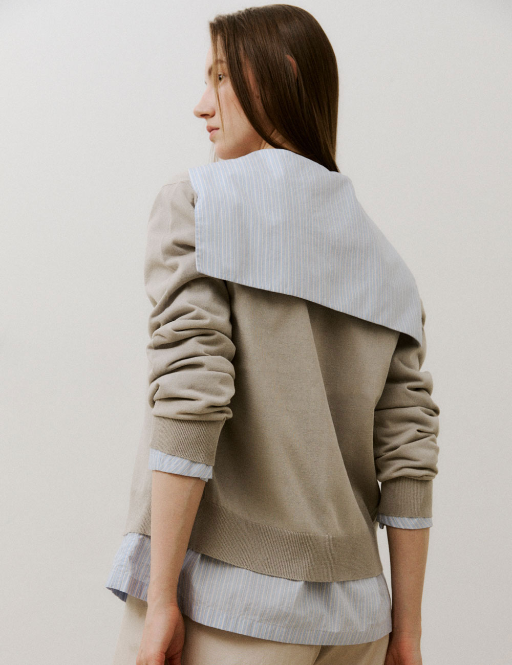 - 레귤러 핏의 스트라이프 면 셔츠 - 워싱 가공으로 부드럽고 자연스러운 터치감 - 세일러 칼라와 버튼 여밈과 리본타이 - 사이드 포켓 - 소매에 턱 디테일