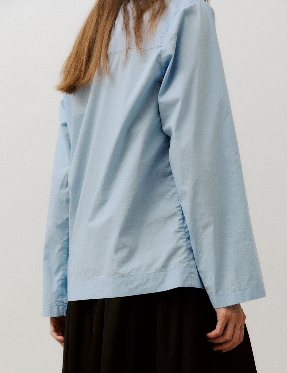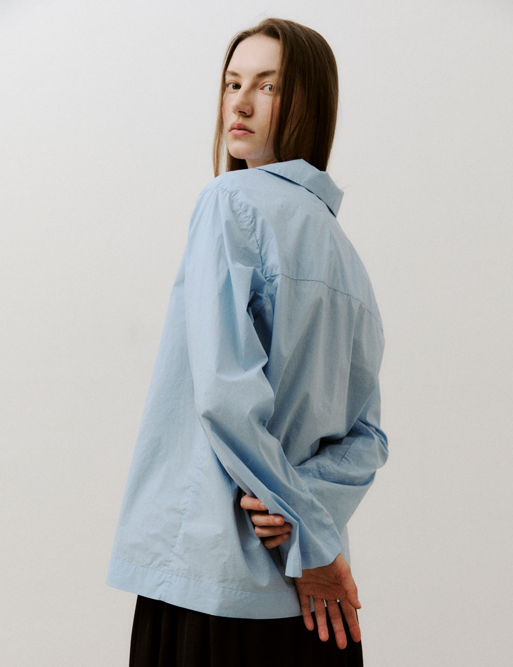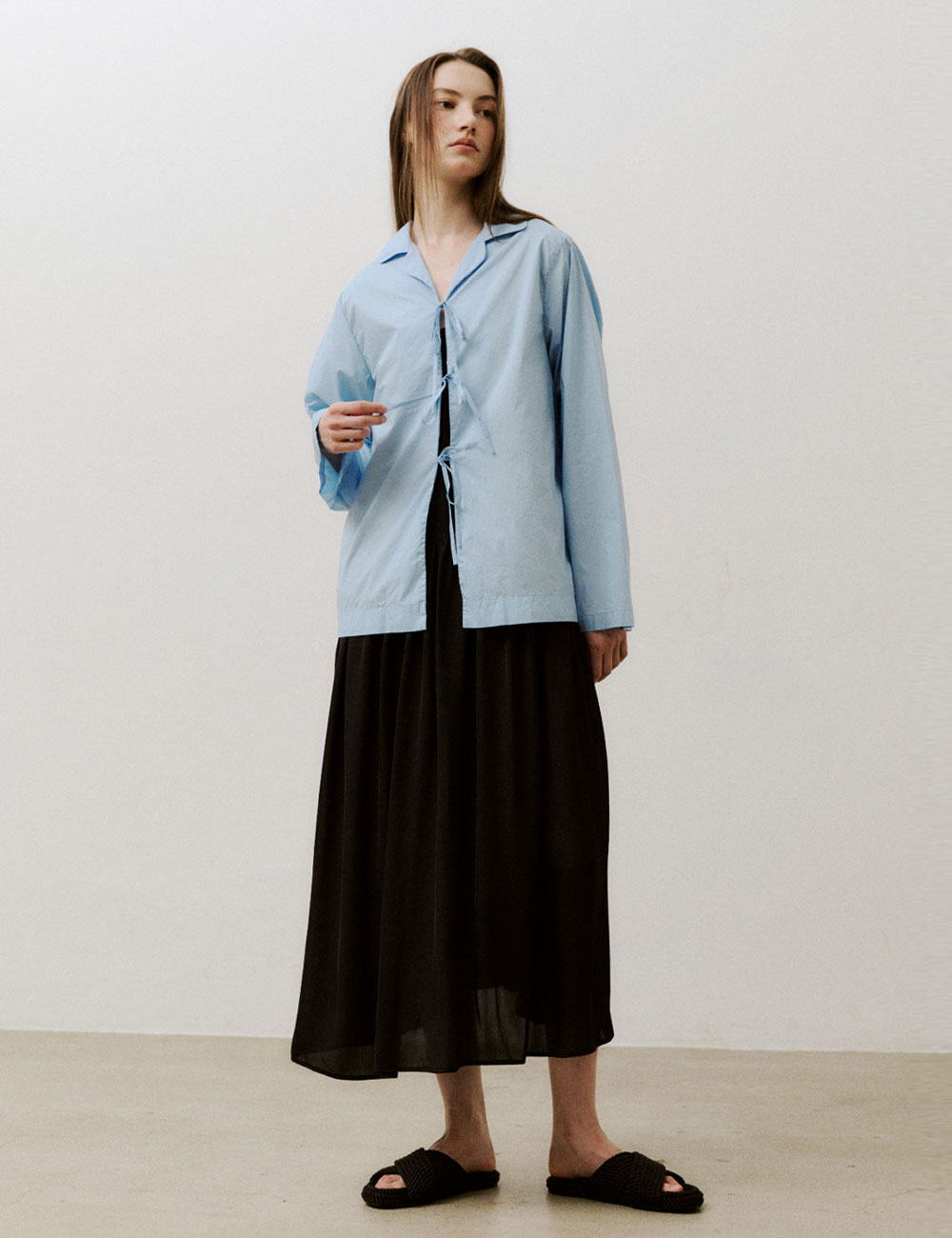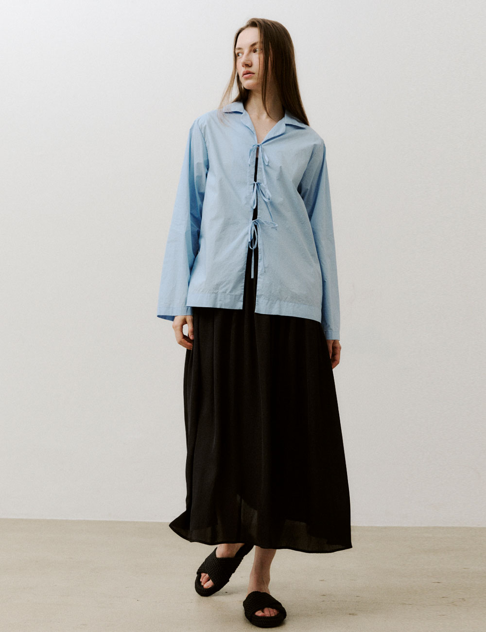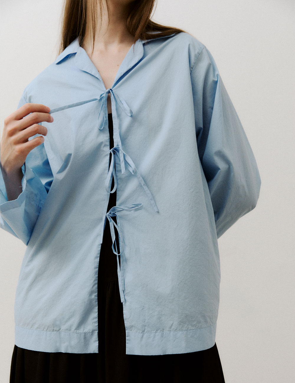 - 레귤러 핏의 타이프라이터 면 셔츠 - 워싱 가공으로 부드럽고 자연스러운 터치감 - 스프레드 칼라와 리본여밈 - 뒷목 다트와 요크 디테일