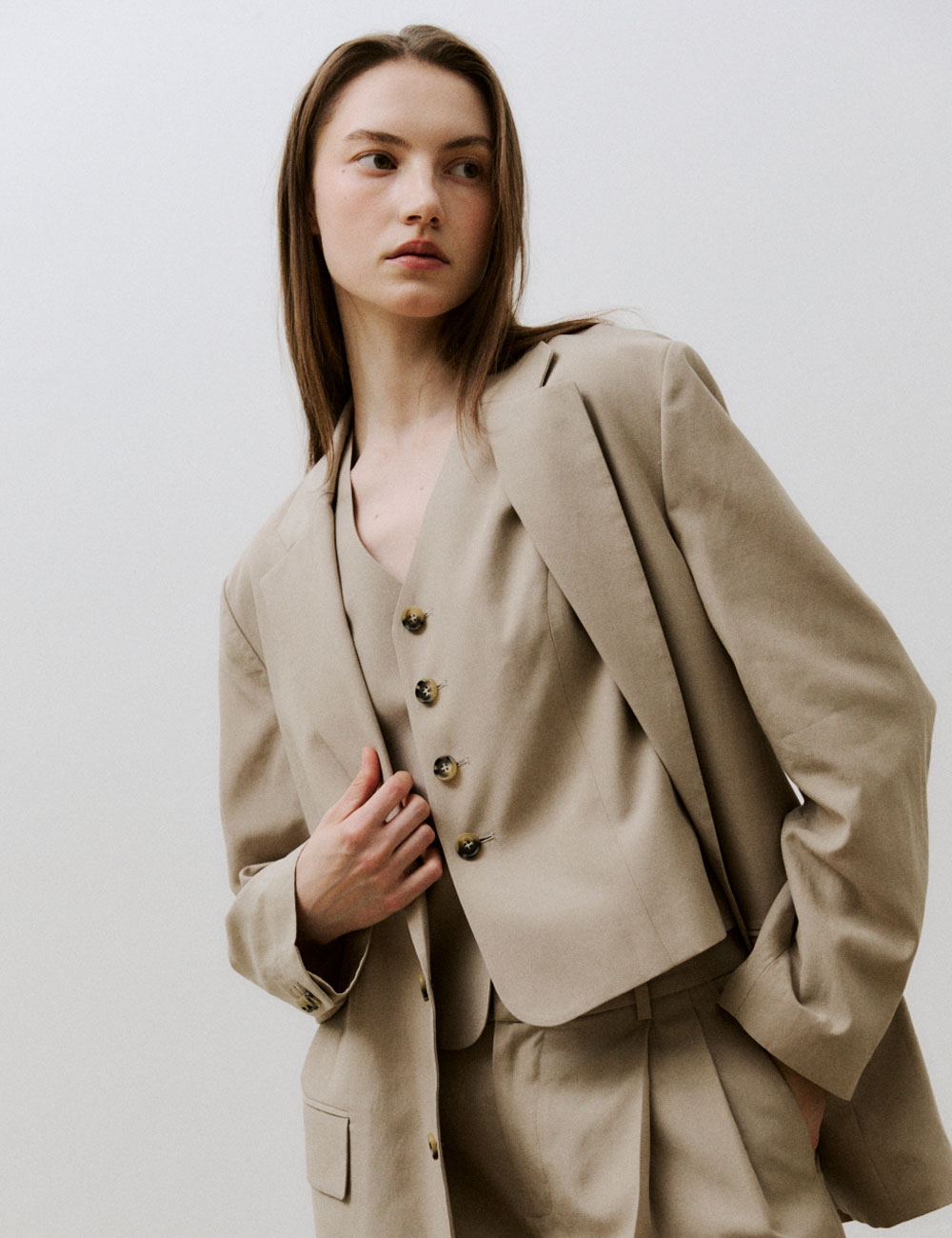 - 텐셀 면 린넨 혼방 베스트 - 브이넥과 포버튼 여밈 - 뒷면에 조절 가능한 버클 스트랩 - 비스코스 폴리에스터 혼방 전체안감 - TENCEL LINEN WIDE LEG PANTS와 함께 셋업 스타일링 가능