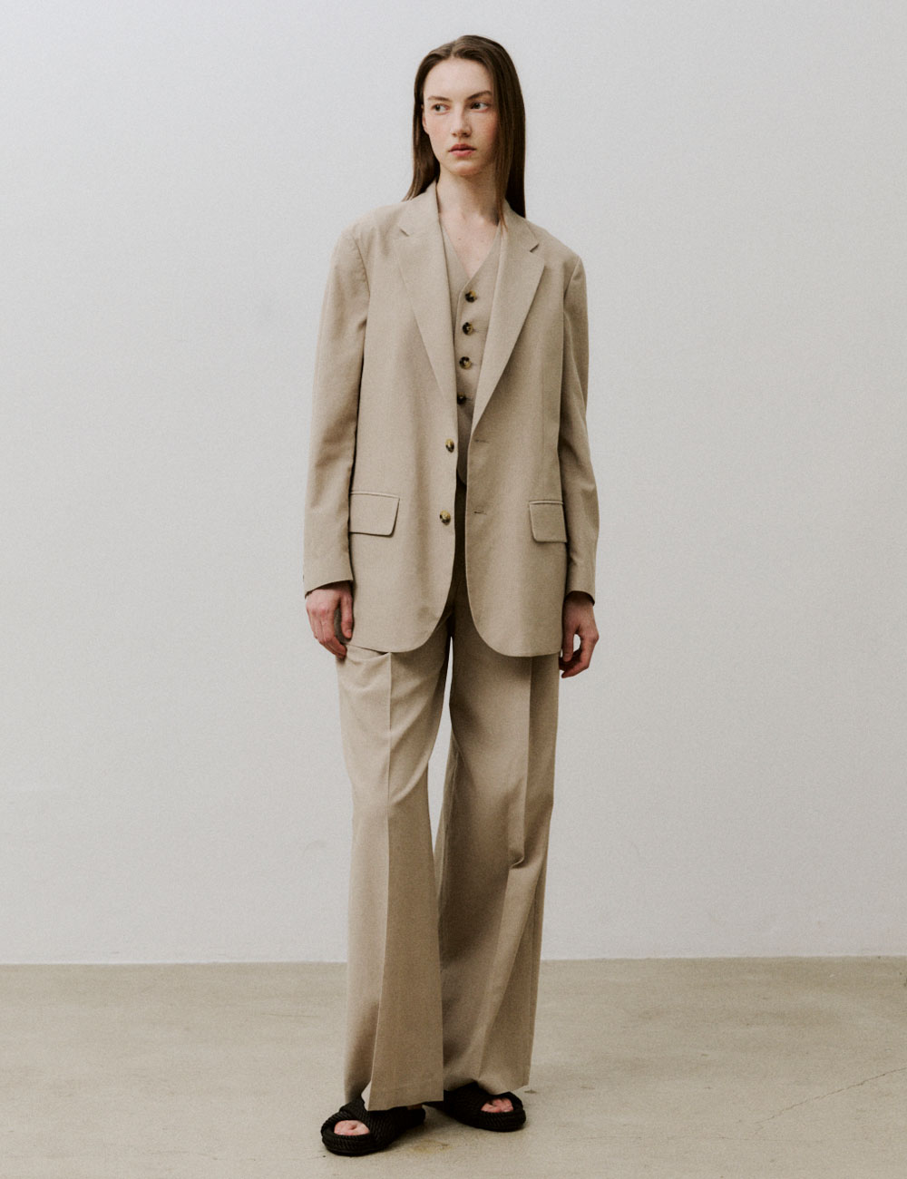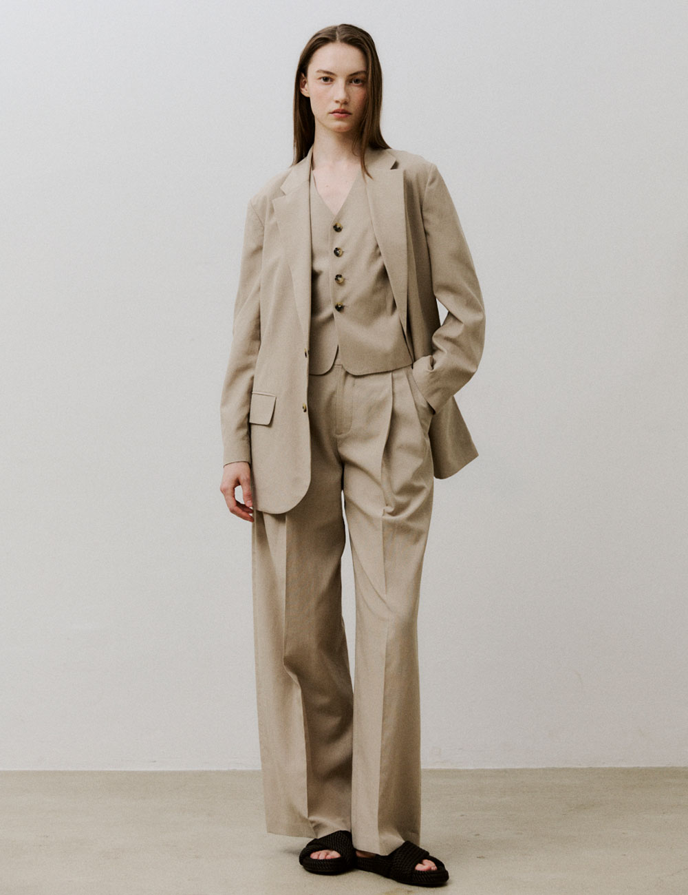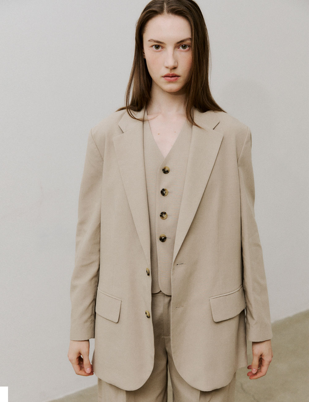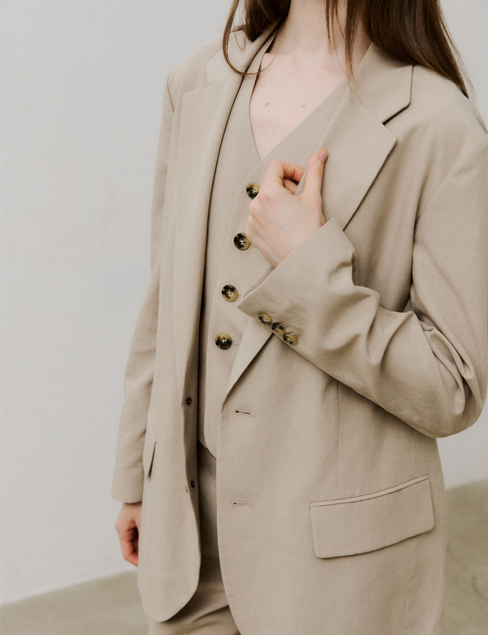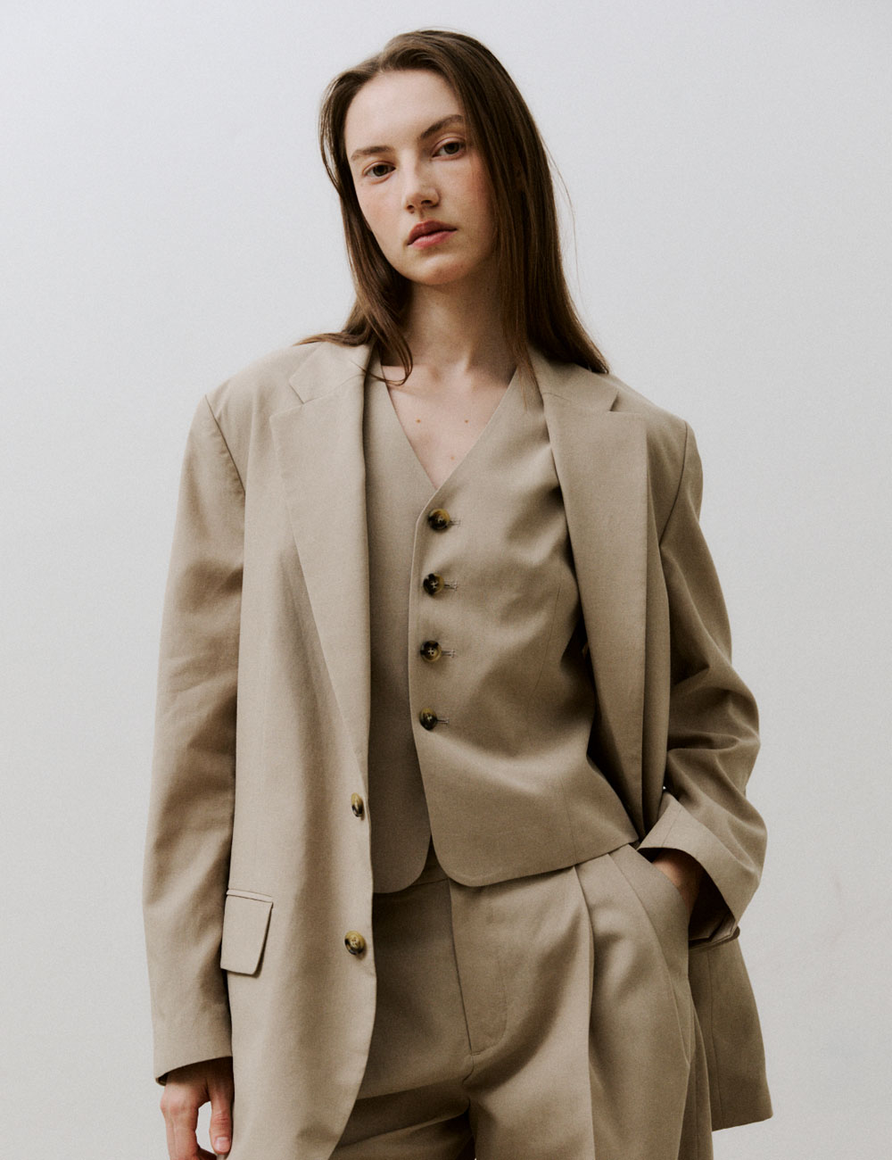 - 텐셀 면 린넨 혼방 블레이저 - 드롭 숄더와 루즈 핏 - 플랩 포켓과 투 버튼 여밈 - 버튼 3개 소맷단 - TENCEL LINEN PANTS과 함께 셋업 스타일링 가능