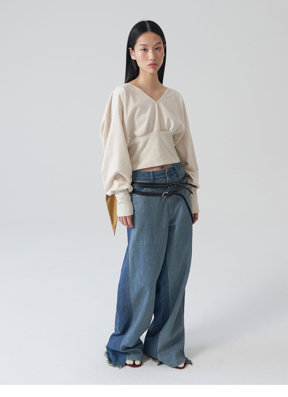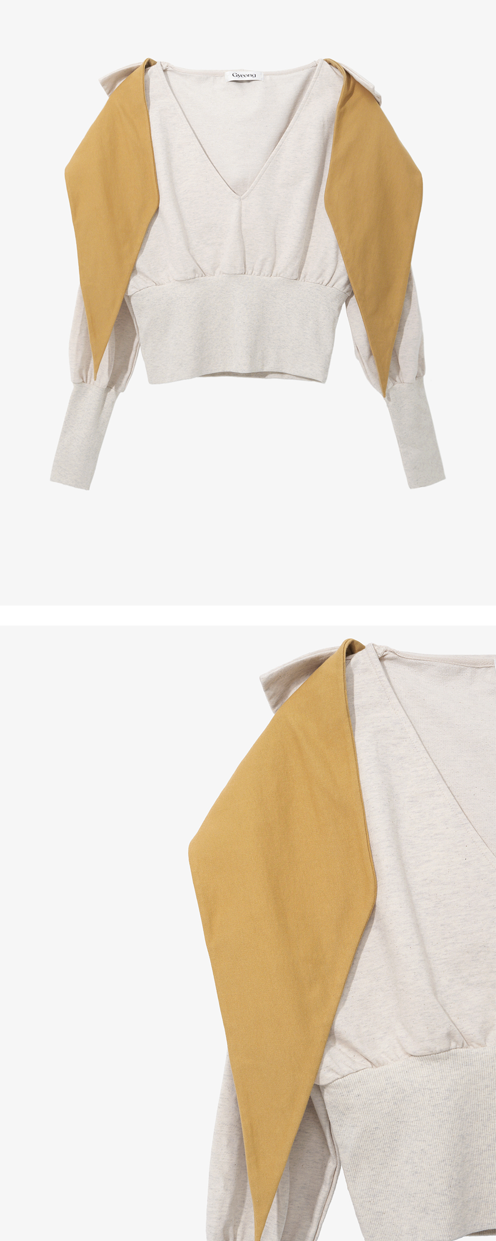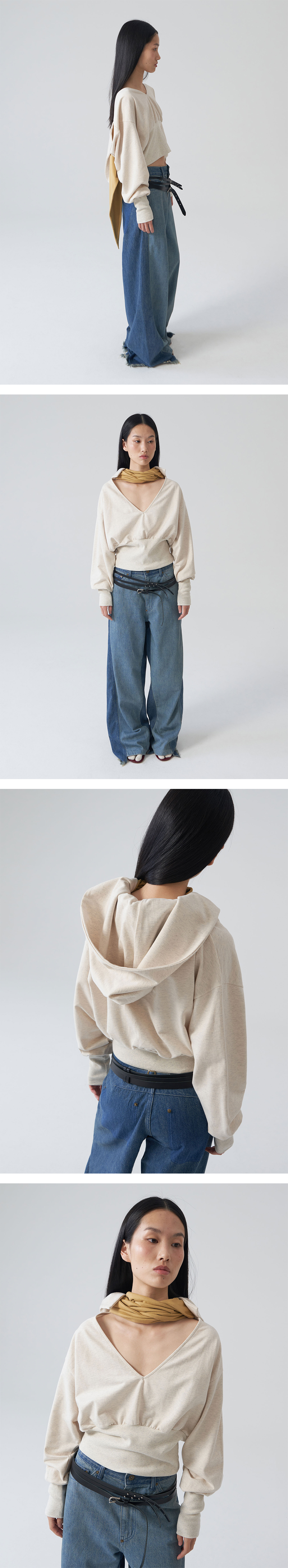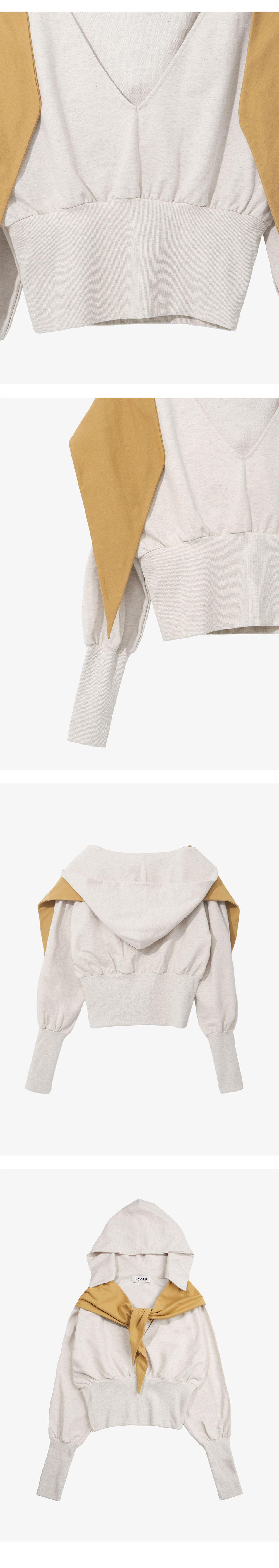 - 깊은 V넥의 스카프 타이 디테일 후드 탑 - 배색 스카프 디테일 - 부드러운 원단의 터치감 - 레귤러 핏의 실루엣 * Shell : 100% Cotton * Made in Korea