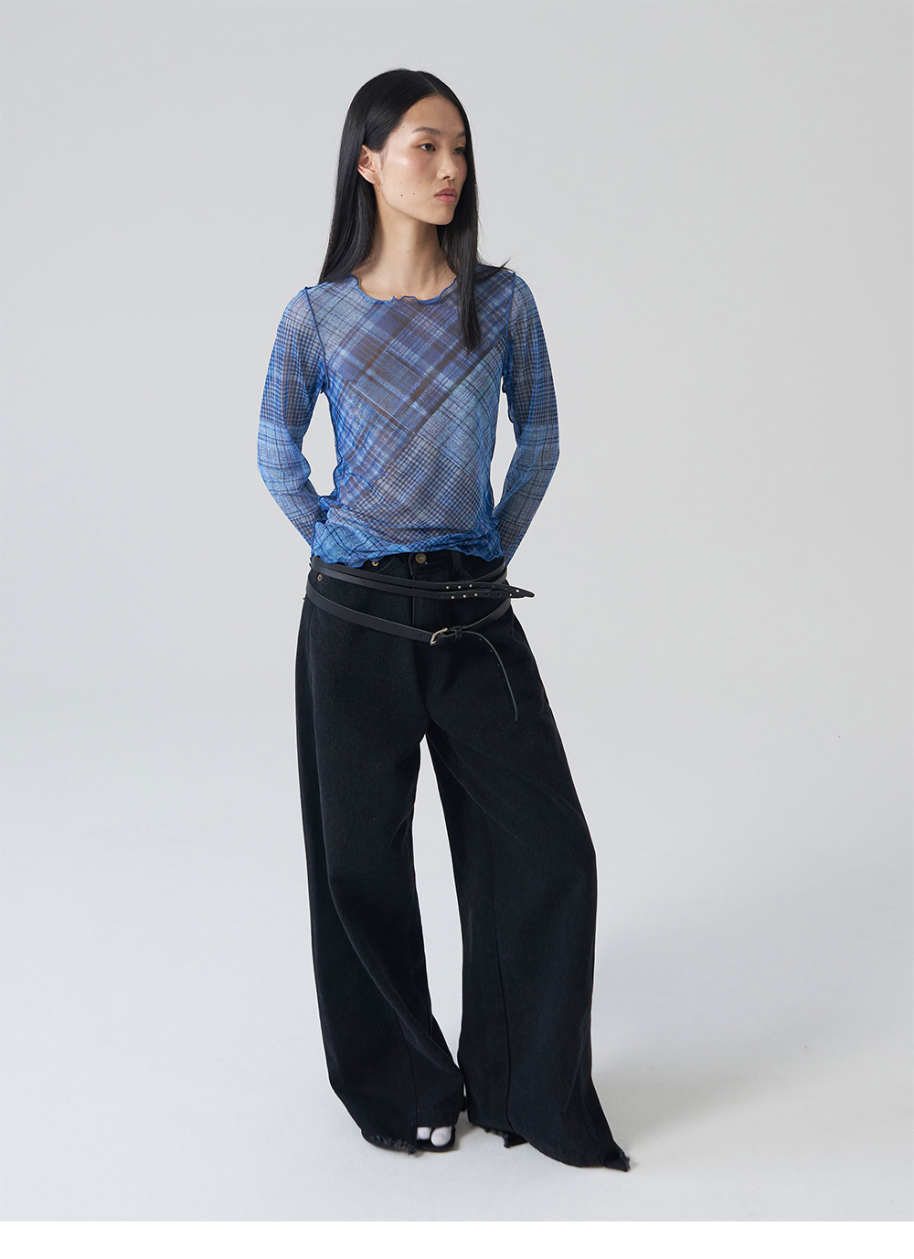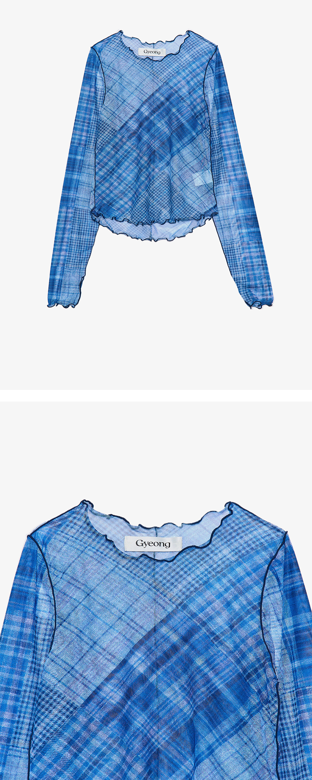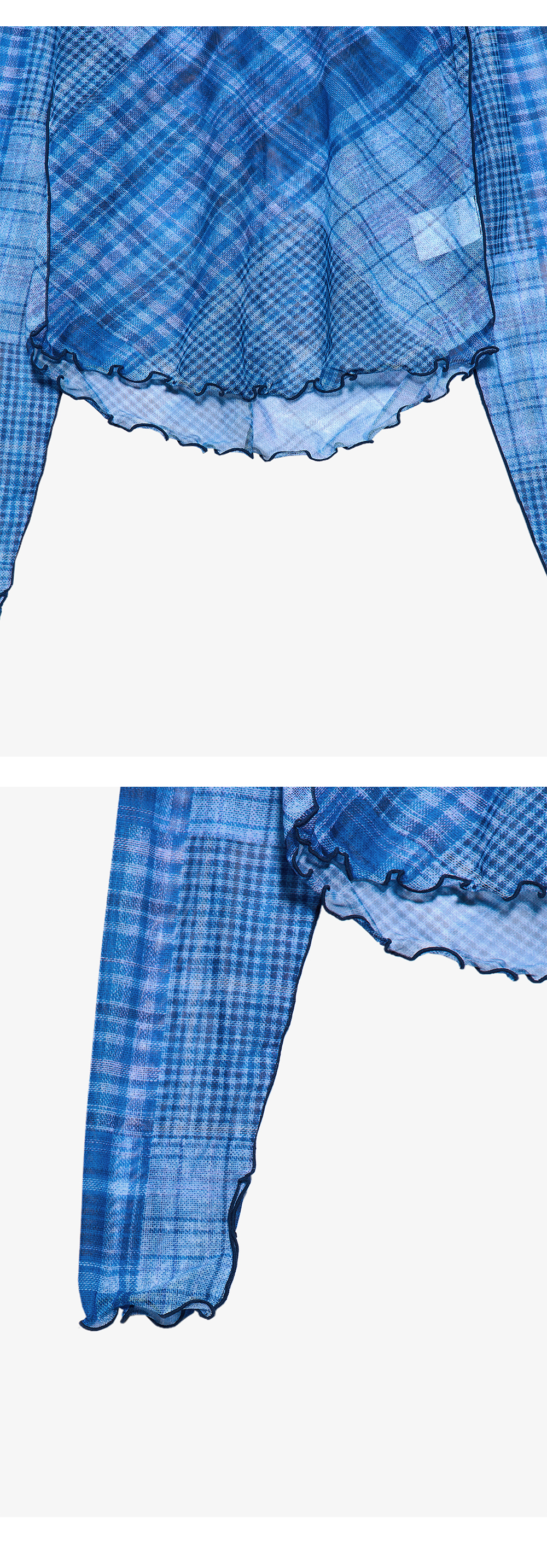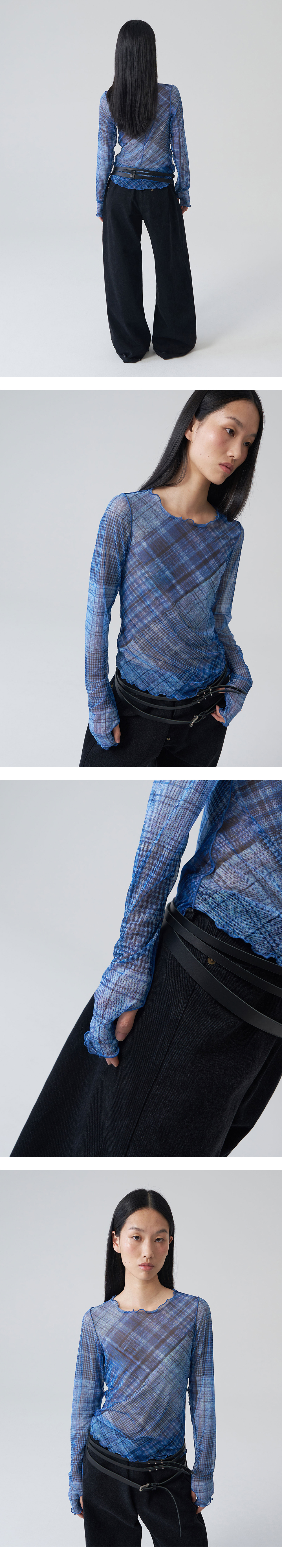 - 전면 프린팅의 체크 메쉬 탑 - 레이어드에 용이 - 웨이비한 사이드, 후면 라인 디테일 - 핑거 홀 디테일 - 방향이 전부 다른 체크 디테일 - 레귤러 핏 실루엣 * Shell : 87% Polyester, 13% Span * Made in Korea