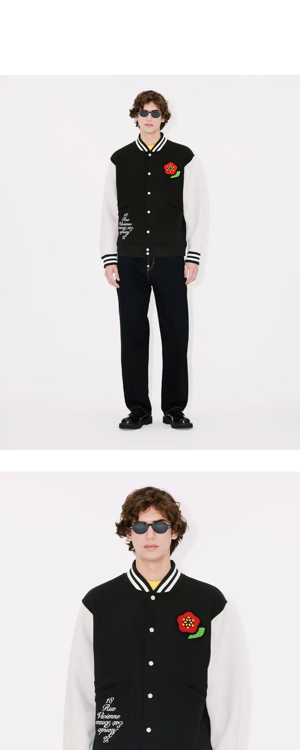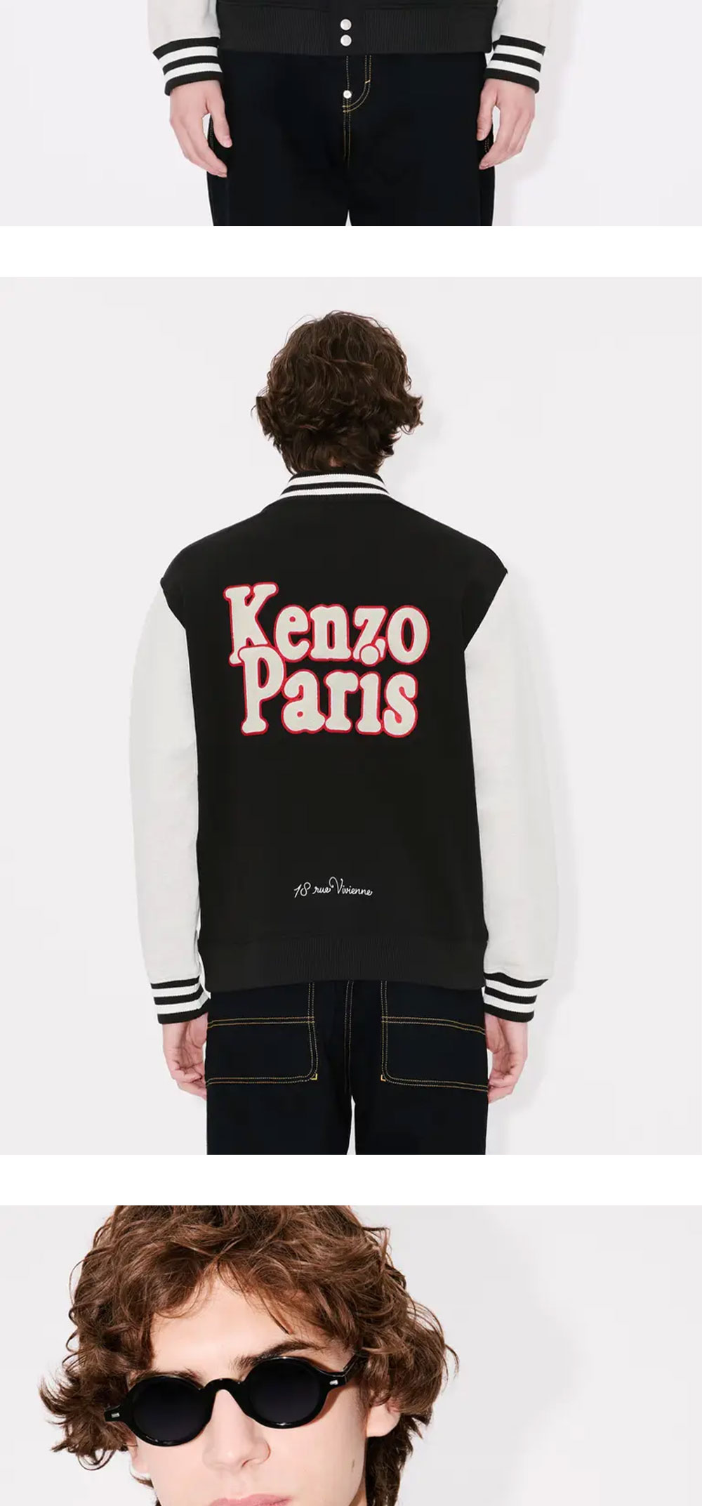 자수가 매력적인 겐조의 바시티 봄버 자켓 입니다. - 가슴에 자수로 새겨진 'KENZO Pop' 그래픽 - 뒷면에 새겨진 부클렛 패치와 체인 스티치 - 칼라와 커프스에 스트라이프 골지 디테일 - 앞주머니와 뒷면 립 위쪽에 자수 장식