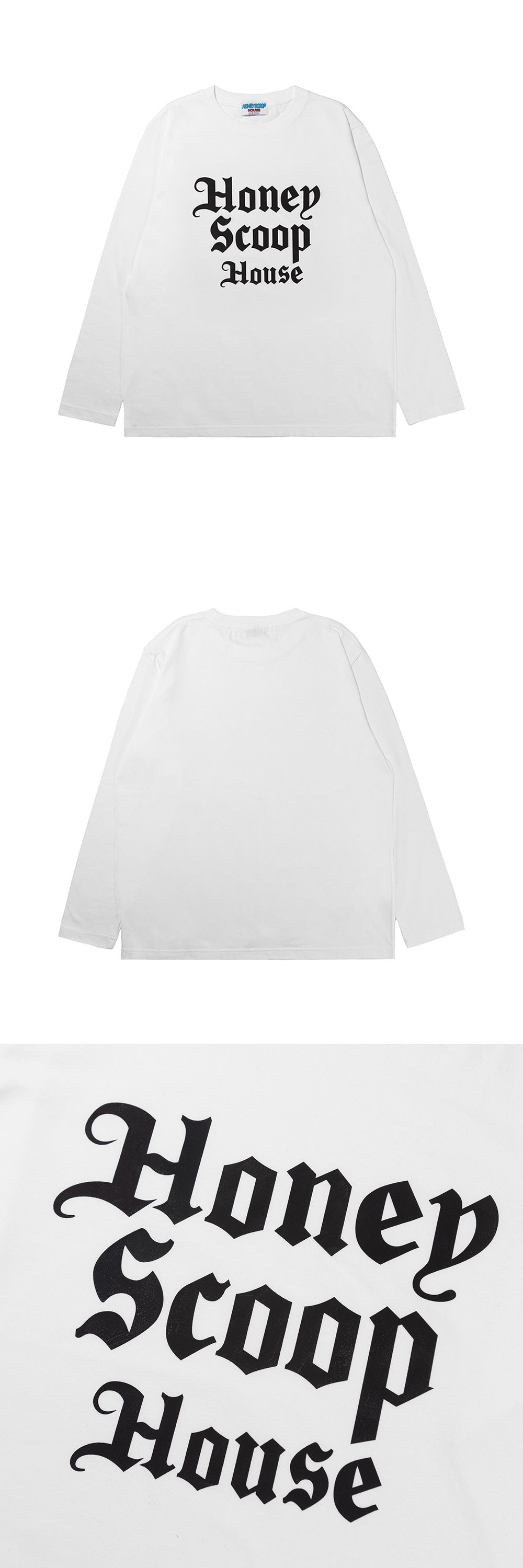 HONEY SCOOP HOUSE OE LOGO L/S TEE WHITE 100% COTTON LONG SLEEVE TEE PRINTED CHEST GRAPHIC