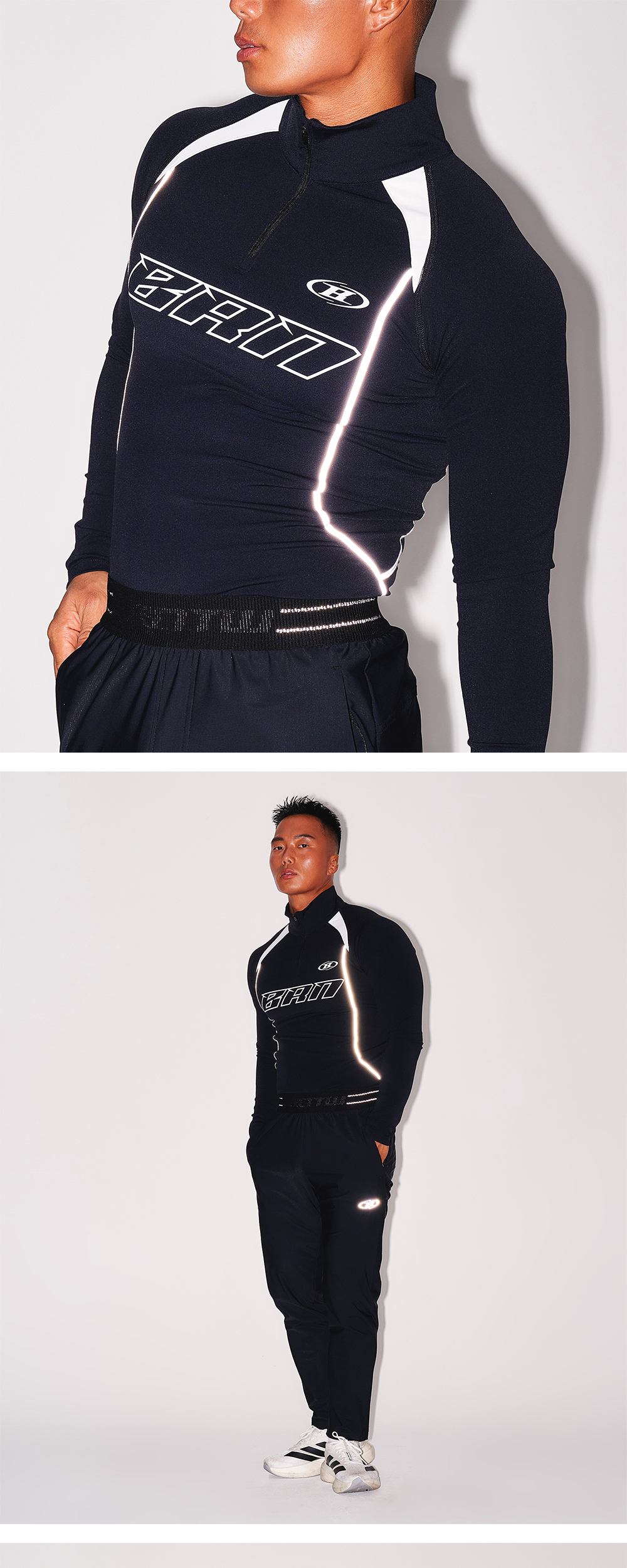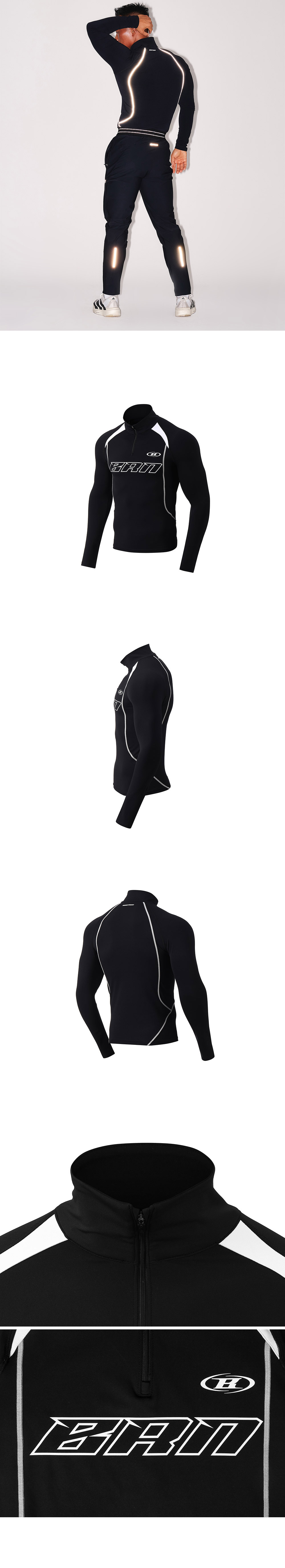 [DETAILS] * BRN 실버라인 하프집업 롱슬리브 - 나일론 하이게이지 원단 - 시그니처 그래픽 포인트 - 래글런 배색 디테일 - 3M 라인 - 머슬핏 Material : Nylon 80%, Polyurethane 20% / Polyester 82%, Polyurethane 18% Fitting : TJ 1 Size, 172cm, 74kg