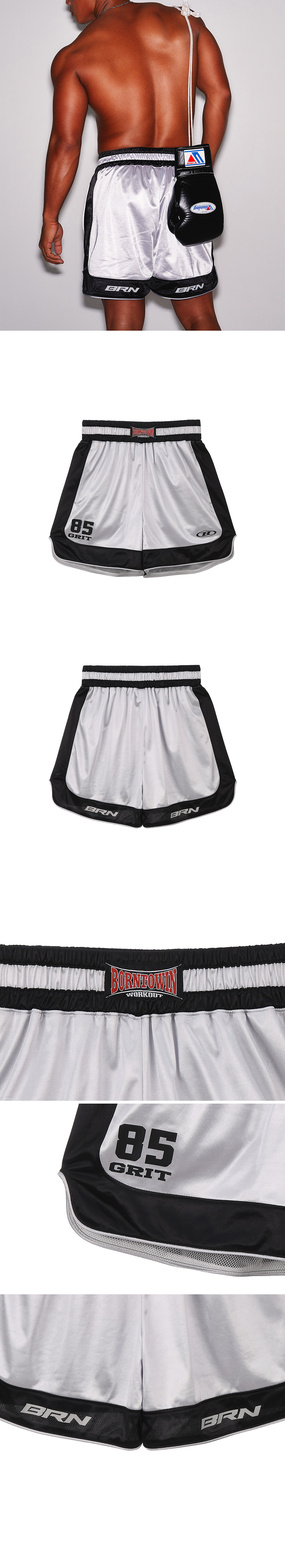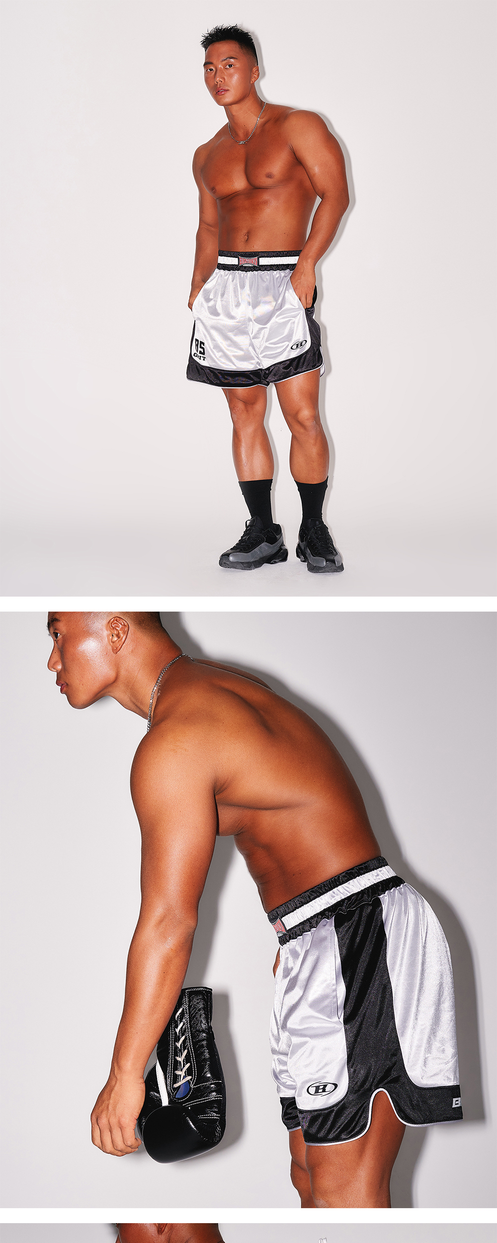[DETAILS] * 그리트 복서 쇼츠 - 폴리새틴 원단 - 복싱 쇼츠 실루엣 - 안감 메쉬 - 시즈널 와펜 포인트 - 고탄성 웨이스트 밴드 Material : Polyester 100% Fitting : TJ 1 Size, 172cm, 74kg