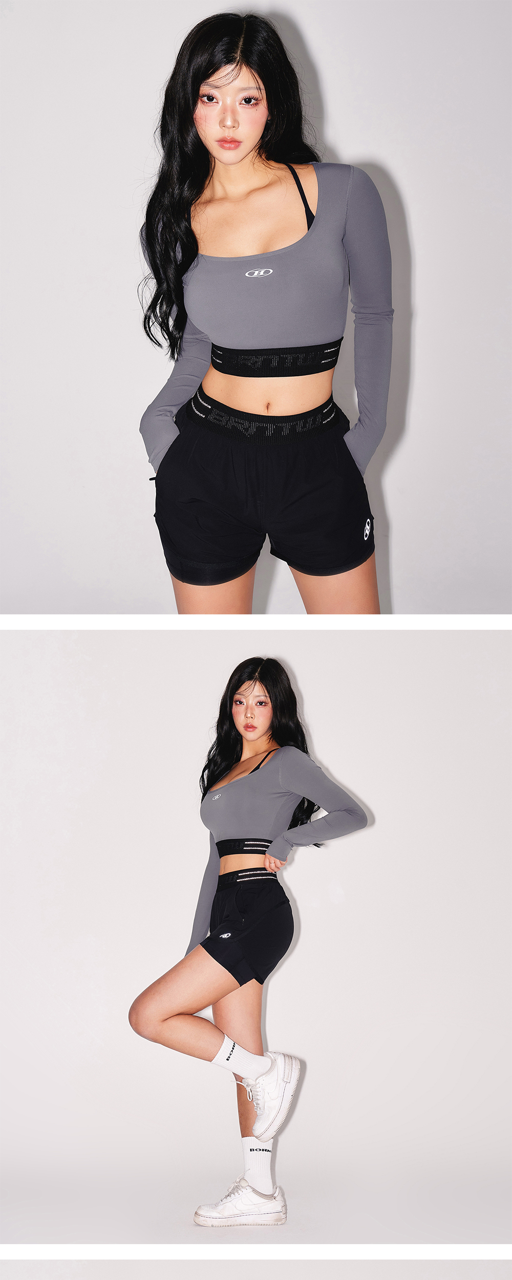 [DETAILS] * 리플렉티브 아웃밴드 크롭 롱슬리브 - 나일론 하이게이지 원단 - 스퀘어 넥라인 디자인 - 고탄성 리플렉티브 아웃밴딩 웨이스트 - 로고 그래픽 포인트 - 데오드란트 테이프 내장 Material : Nylon 80%, Polyeurethane 20% Fitting : GY 1 Size, 165cm, 53kg