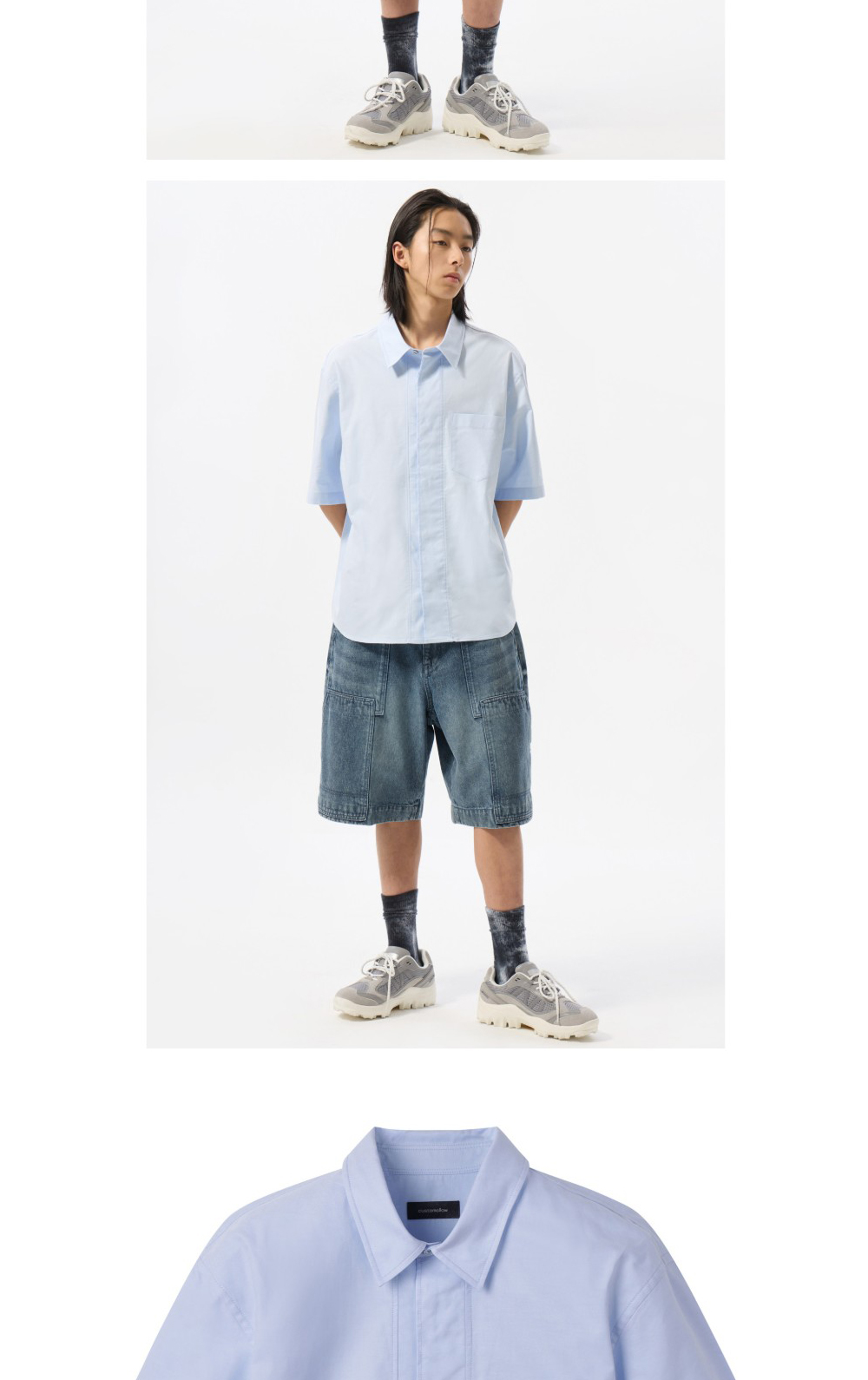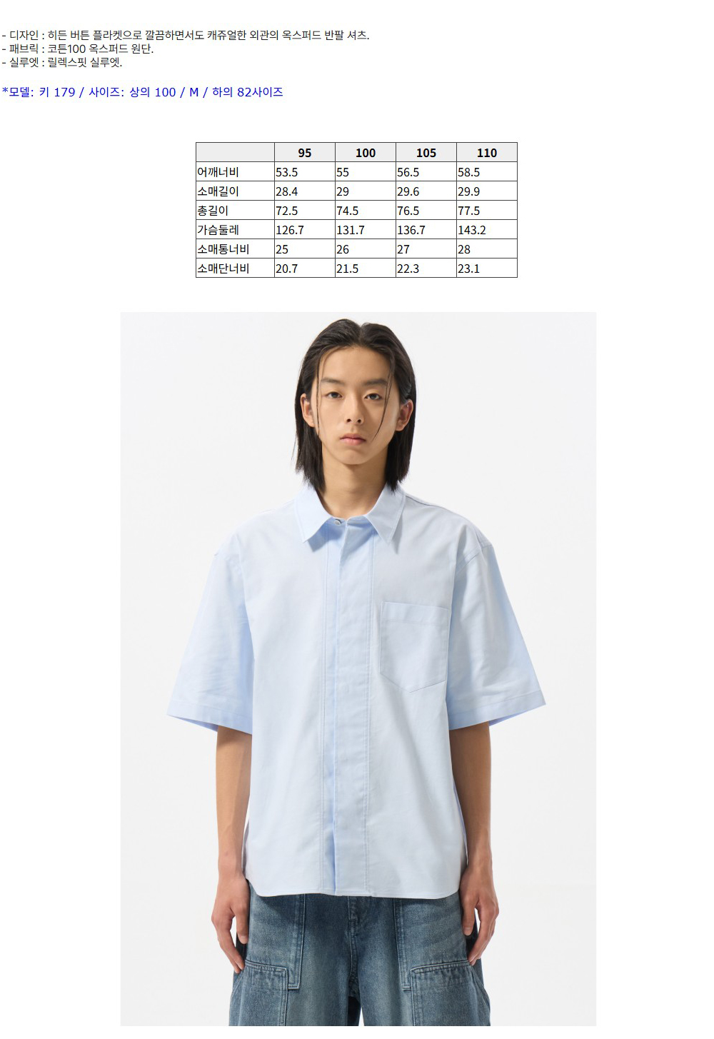 커스텀멜로우 히든 버튼 옥스포드 하프 셔츠 블루