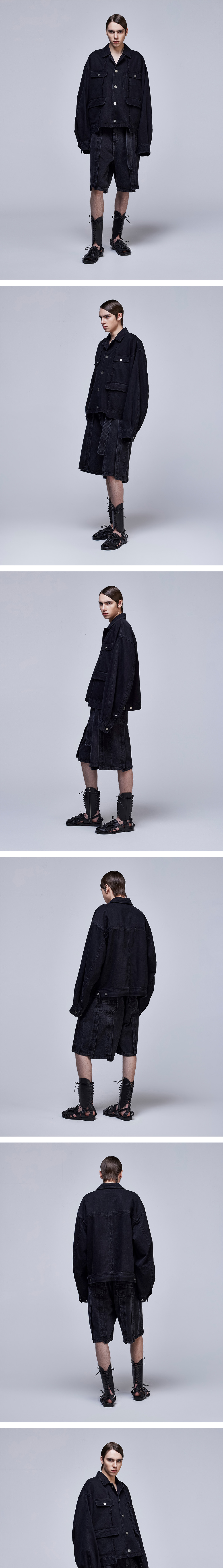 - 어시메트릭 컷 코쿤핏 데님 트러커 - 부드러운 터치감의 탄탄한 데님 원단 사용 - 자연스러운 데님 질감을 살려주는 스톤 바이오 워싱 - 비대칭 로우 커팅 라인 포켓 플랩 - 카라에 위치한 금속 SONGZIO LOGO 부토니에 장식 - 입체 패턴과 다트를 이용한 시그니처 코쿤 실루엣 - 사이즈 조절 가능한 소매단과 밑단 장식 디테일 - 속 포켓 구성 - MADE IN KOREA