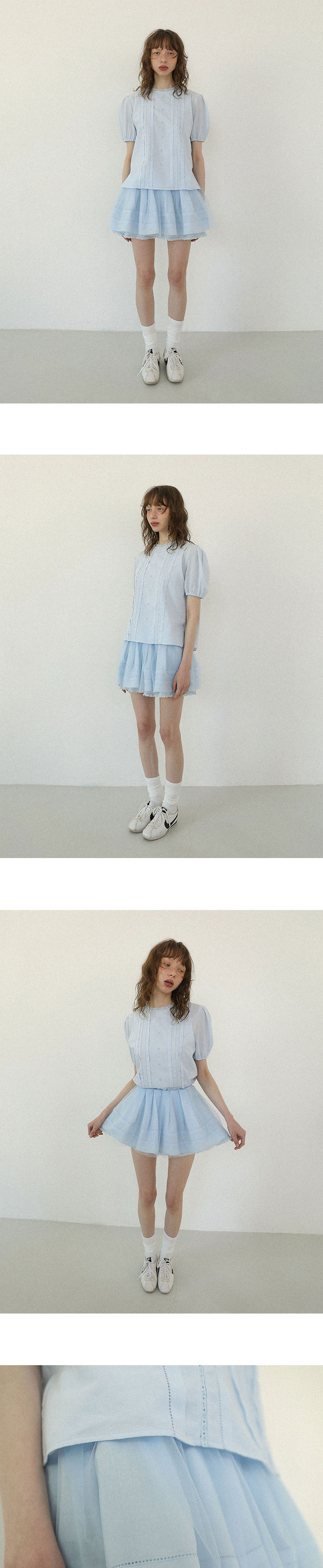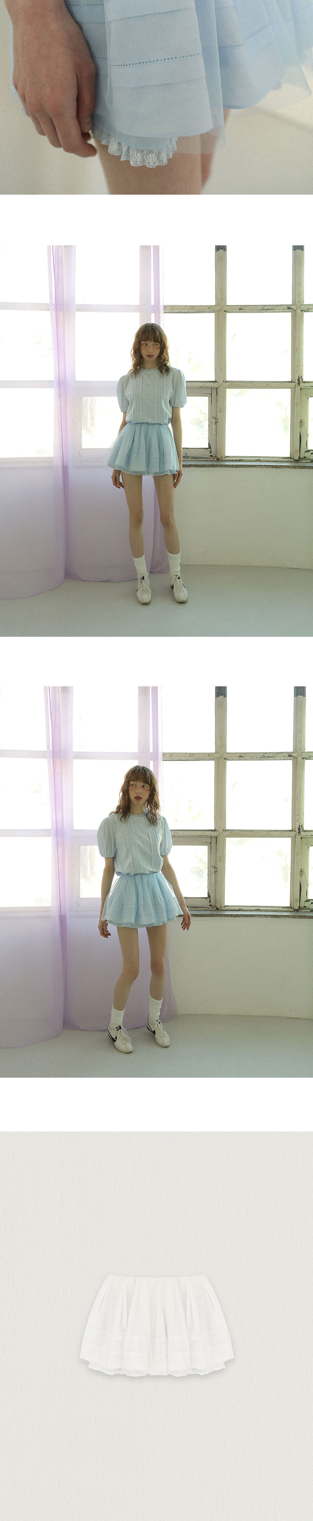 - 내장 허리밴드로 오비가 없는 허리라인 고급스러운 마감처리 - 안감에 밑단 레이스 디테일, 겉감에 핀턱 디테일 - 안감, 겉감, 튤의 세겹 원단을 사용하여 풍성한 실루엣 연출 - 안감이 있어 비침 없으며 단독으로 착용 가능