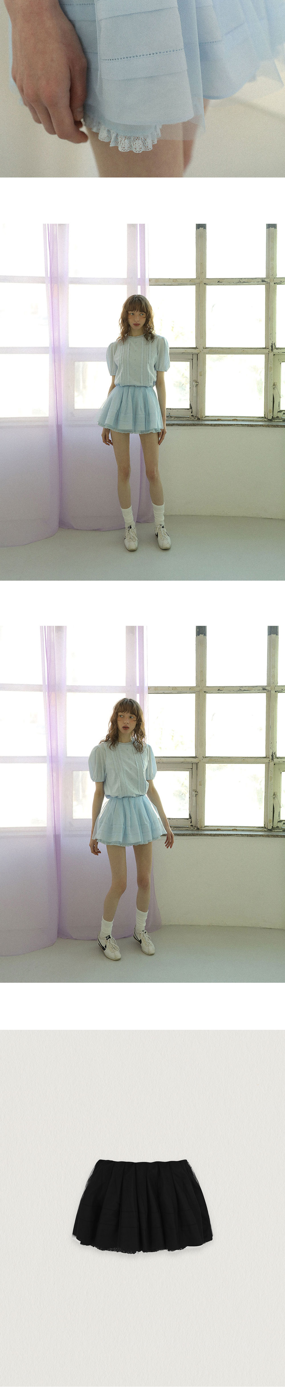 - 내장 허리밴드로 오비가 없는 허리라인 고급스러운 마감처리 - 안감에 밑단 레이스 디테일, 겉감에 핀턱 디테일 - 안감, 겉감, 튤의 세겹 원단을 사용하여 풍성한 실루엣 연출 - 안감이 있어 비침 없으며 단독으로 착용 가능