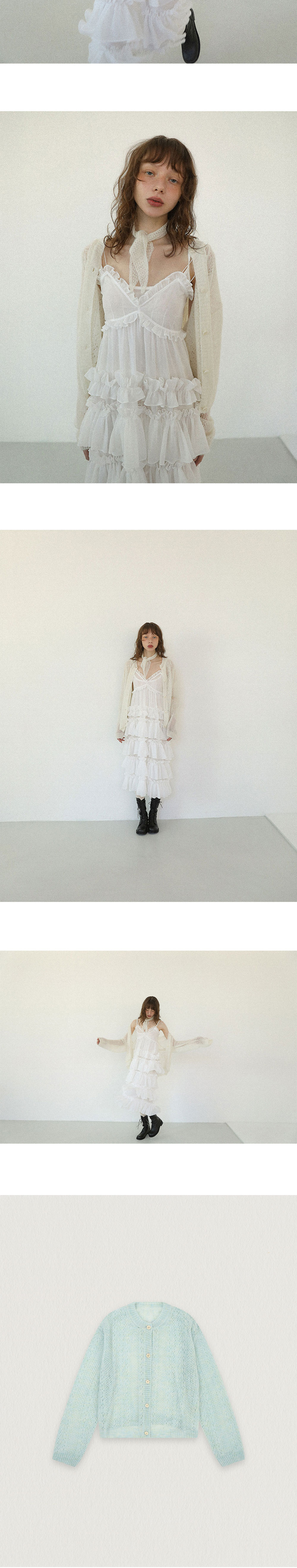 - 여유있는 실루엣의 스카시 가디건 - 모헤어와 울혼방의 원사로 7게이지 편직 - 성글게 짜여진 레이스같은 조직감이 포인트 - 자사로고각인 너트단추 - 스카프에 자사로고각인 너트참 - 단독 또는 구성품인 스카프와 함께 착용가능