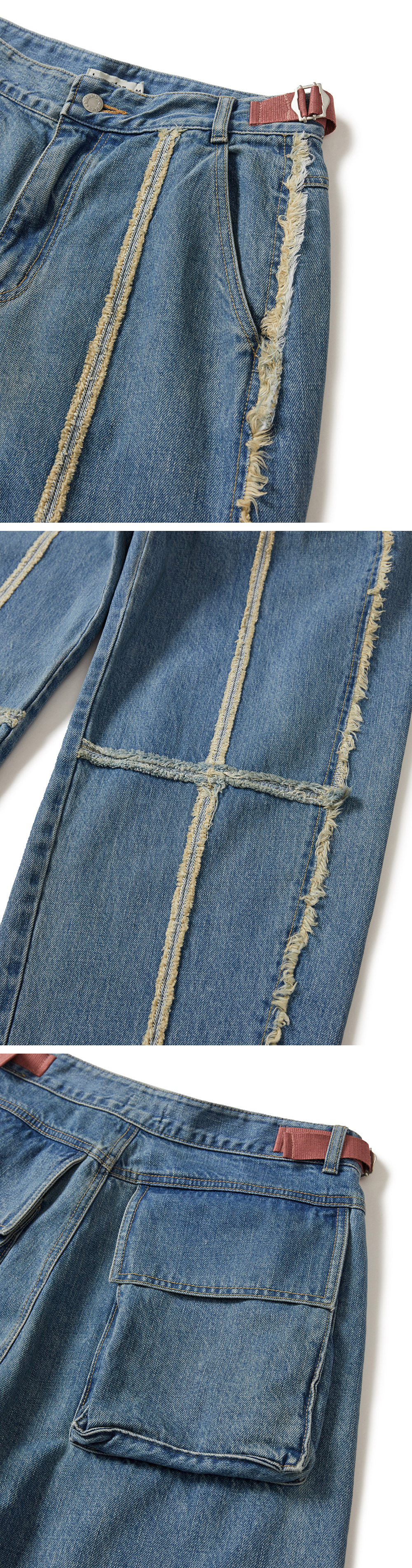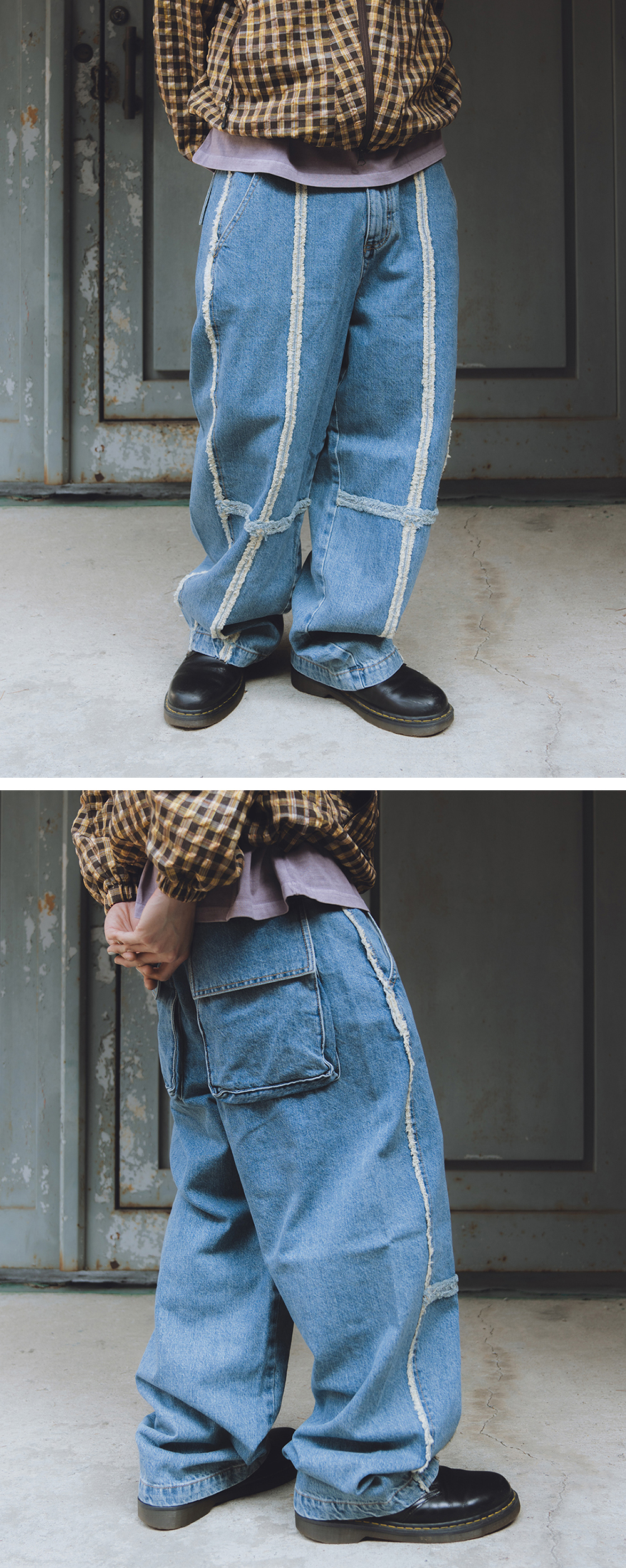 Product Info. - 계절감 영향이 적고 적당한 두께감의 13oz 고품질 데님 원단 - 워싱 공정을 거쳐 소프트한 스킨십과 빈티지한 텍스처 - 미묘하게 커브드 라인으로 떨어지는 와이드 테이퍼드 실루엣 - 커팅 패널의 올이 내추럴하게 풀어지는 디자인 - 요크 플랩과 입체적인 형태의 백 포켓 디자인 - 벨트라인 양 사이드 컬러 블럭 어드저스터