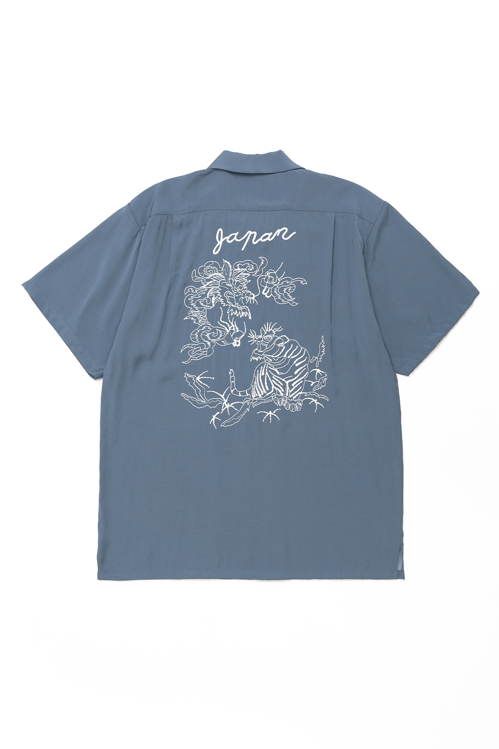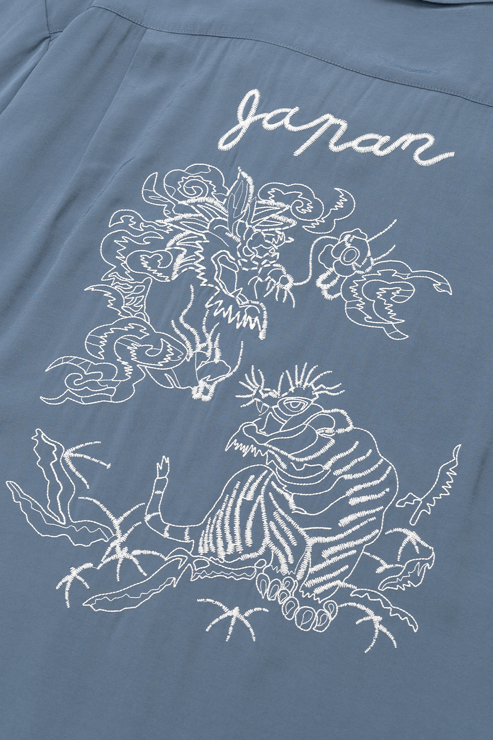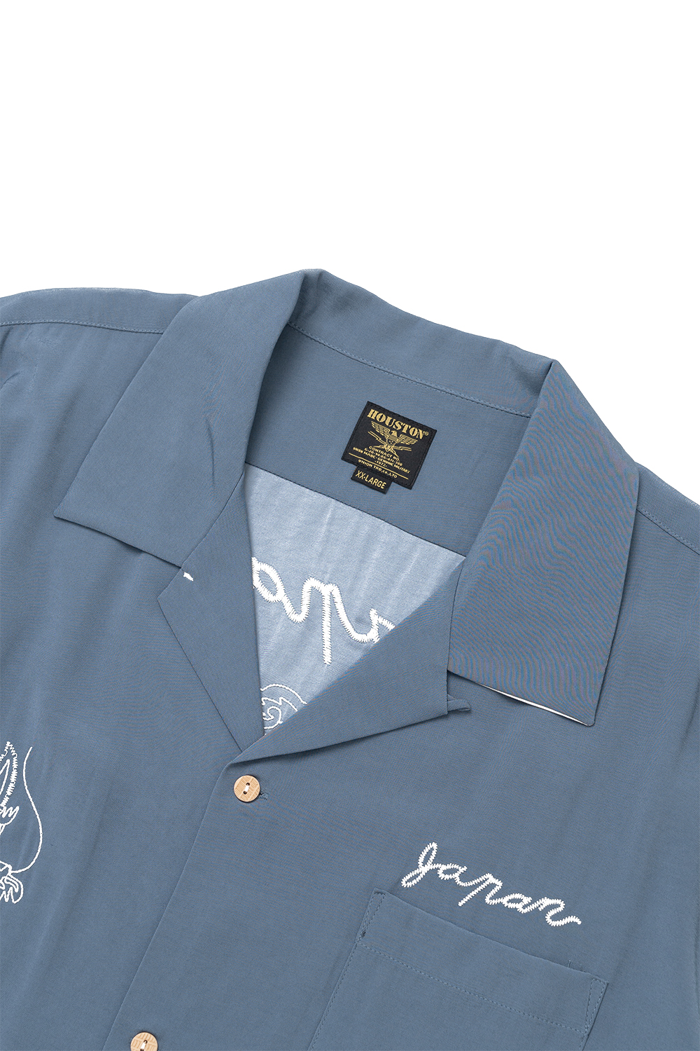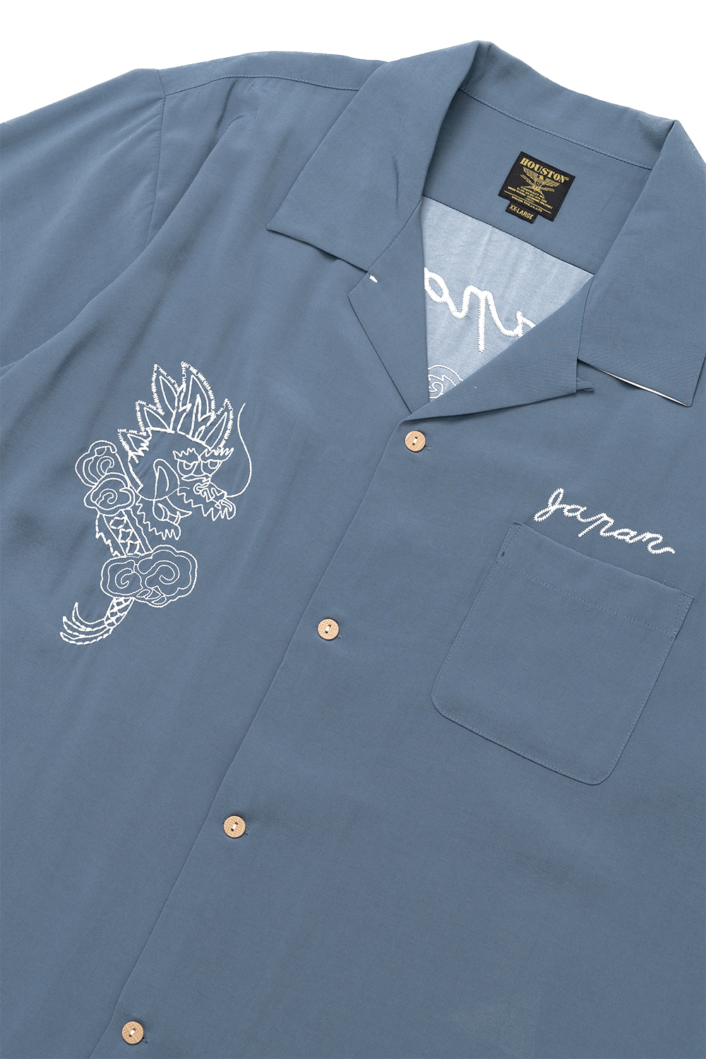 Houston Japan 41155 Souvenir Shirt (Ryu&Tora) - Blue Houston Japan 의 스테디셀러인 수베니어 셔츠입니다. 앞판의 가슴에 있는 용 자수와 뒷 판 용과 호랑이 자수가 특징인 제품입니다. * Polyester 52% / Rayon 48% * 빛에 의한 제품의 색감 차이가 존재 할 수 있습니다. * Made in China