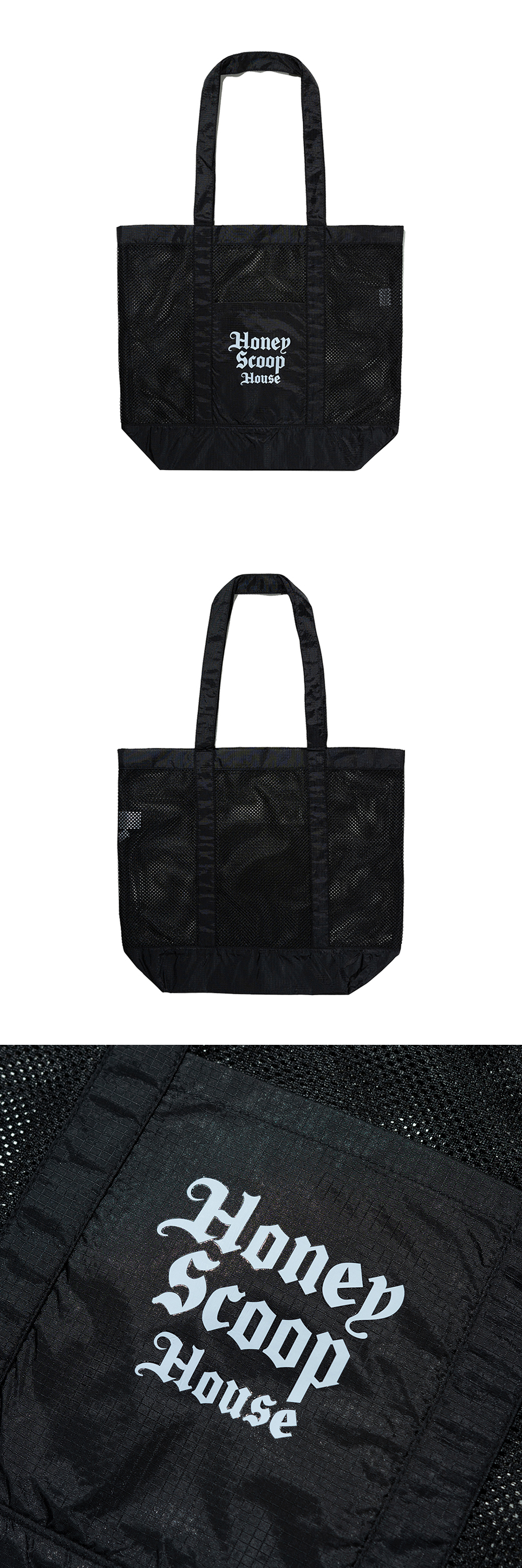 HONEY SCOOP HOUSE OE LOGO MESH TOTE BAG BLACK 100% NYLON FRONT GRAPHIC SHOULDER STRAP