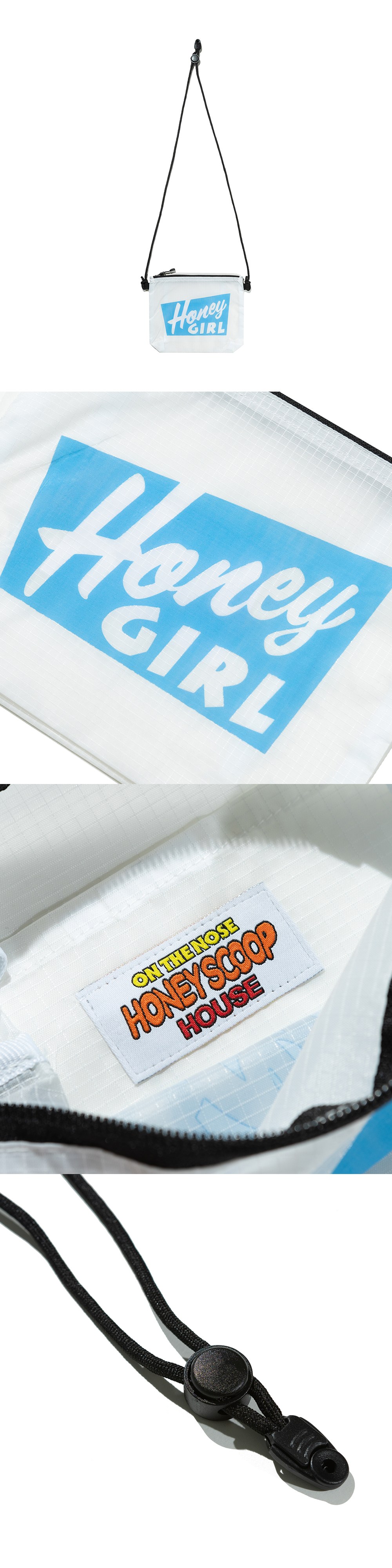 HONEY SCOOP HOUSE HONEY GIRL RIPSTOP SACOCHE WHITE 100% POLYESTER FRONT GRAPHIC ZIP COMPARTMENT ADJUSTABLE SHOULDER STRAP
