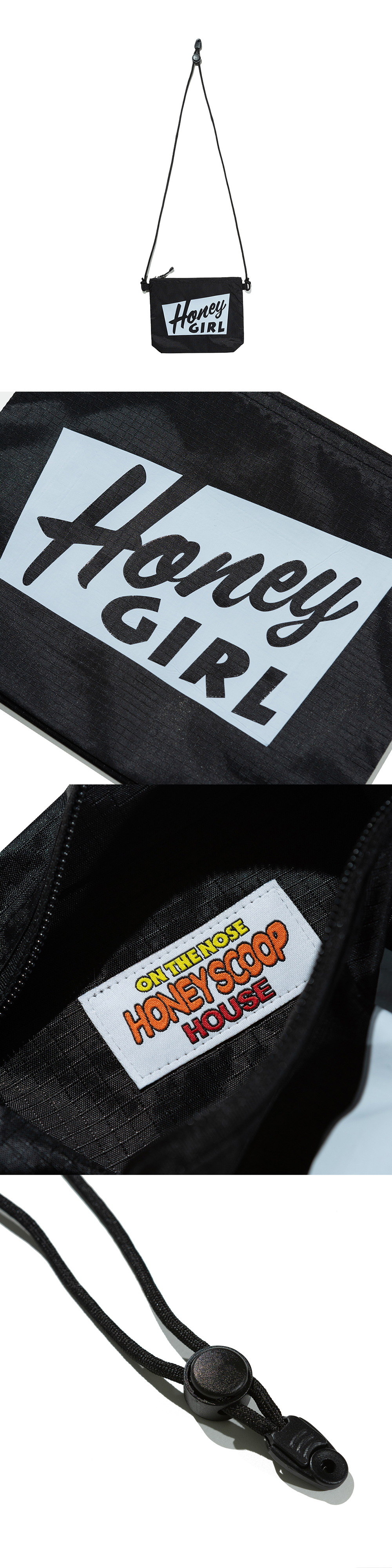 HONEY SCOOP HOUSE HONEY GIRL RIPSTOP SACOCHE BLACK 100% POLYESTER FRONT GRAPHIC ZIP COMPARTMENT ADJUSTABLE SHOULDER STRAP